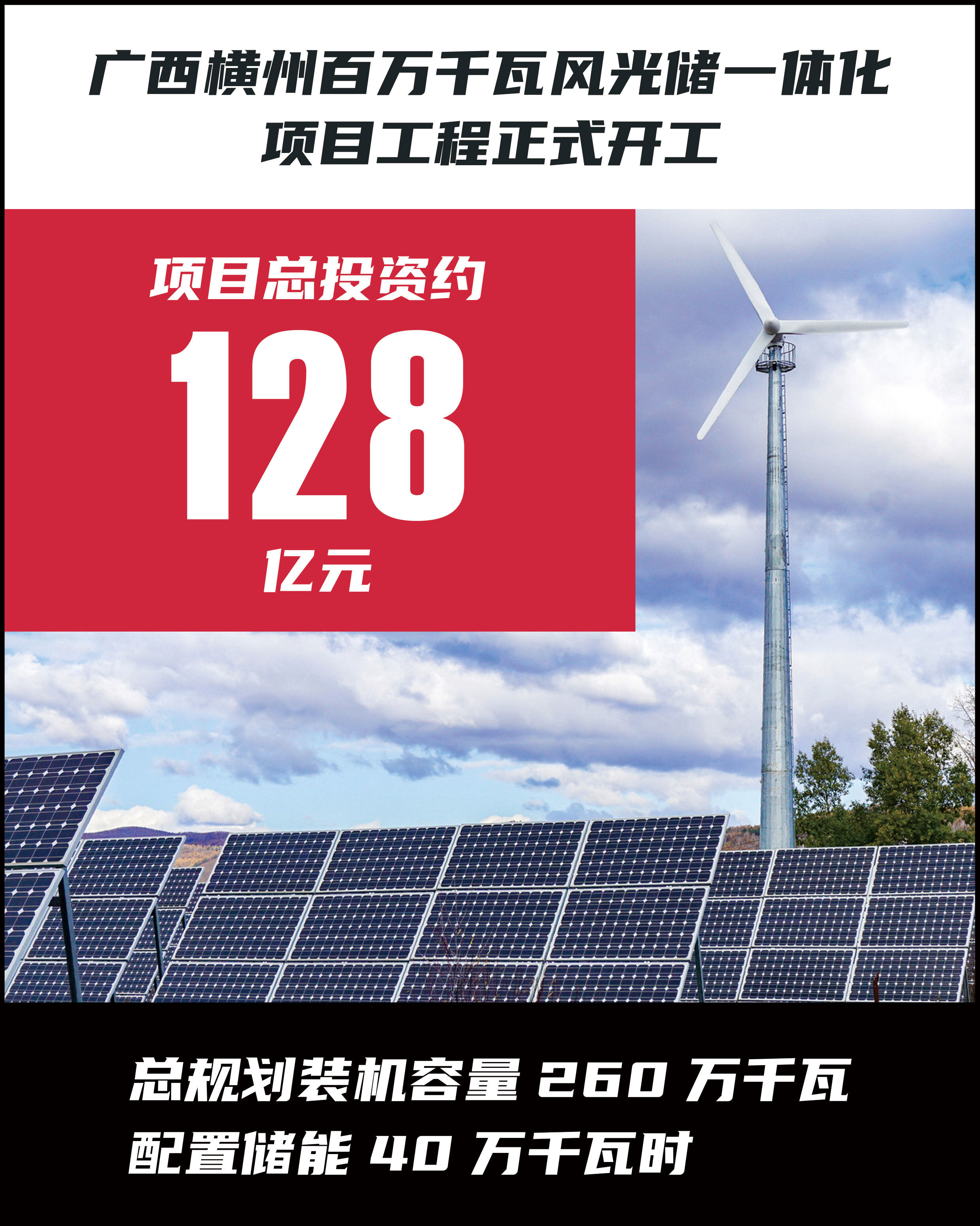 据介绍,该项目总投资约128亿元,是广西2021年单体最大的一体化项目。项目分布于横州市17个乡镇,涵盖横州市六景风光储氢一体化示范项目和茉莉风光储一体化项目,总规划装机容量260万千瓦,配置储能40万千瓦时,由广西龙源风力发电有限公司投资建设,中国安能集团第一工程局有限公司为EPC总承包方。该项目将于2023年全容量建成投产,投产后,年平均发电量约32亿千瓦时,每年可节约标准煤约 169万吨,减排二氧化碳约 624 万吨,并可减少二氧化硫、氮氧化物等多种有害气体排放。关键词:新能源项目、基建项目