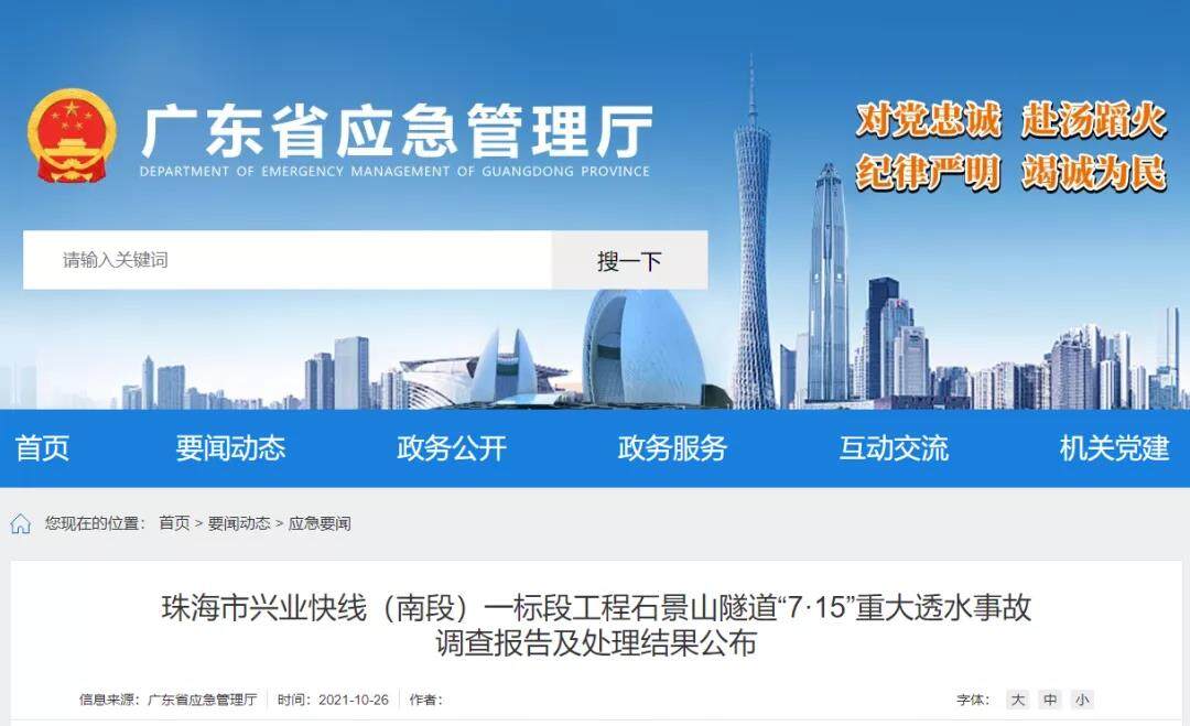 Recently, the Guangdong Provincial Government approved the “July 15” major water penetration accident investigation report of the Shijingshan Tunnel in the first section of the Zhuhai Xingye Express (south section), and recognized that the Shijingshan Tunnel “7. ·The 15" water penetration accident is a major production safety liability accident.