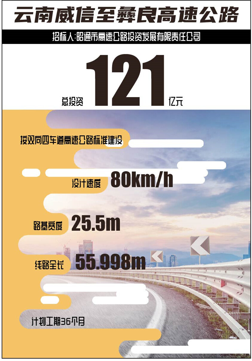 2021年10月26日,昭通市公共资源交易电子服务系统发布威信至彝良高速公路投资人暨合作承包建设者第二次招标招标公告,招标人昭通市高速公路投资发展有限责任公司,估算总投资约为121亿元。