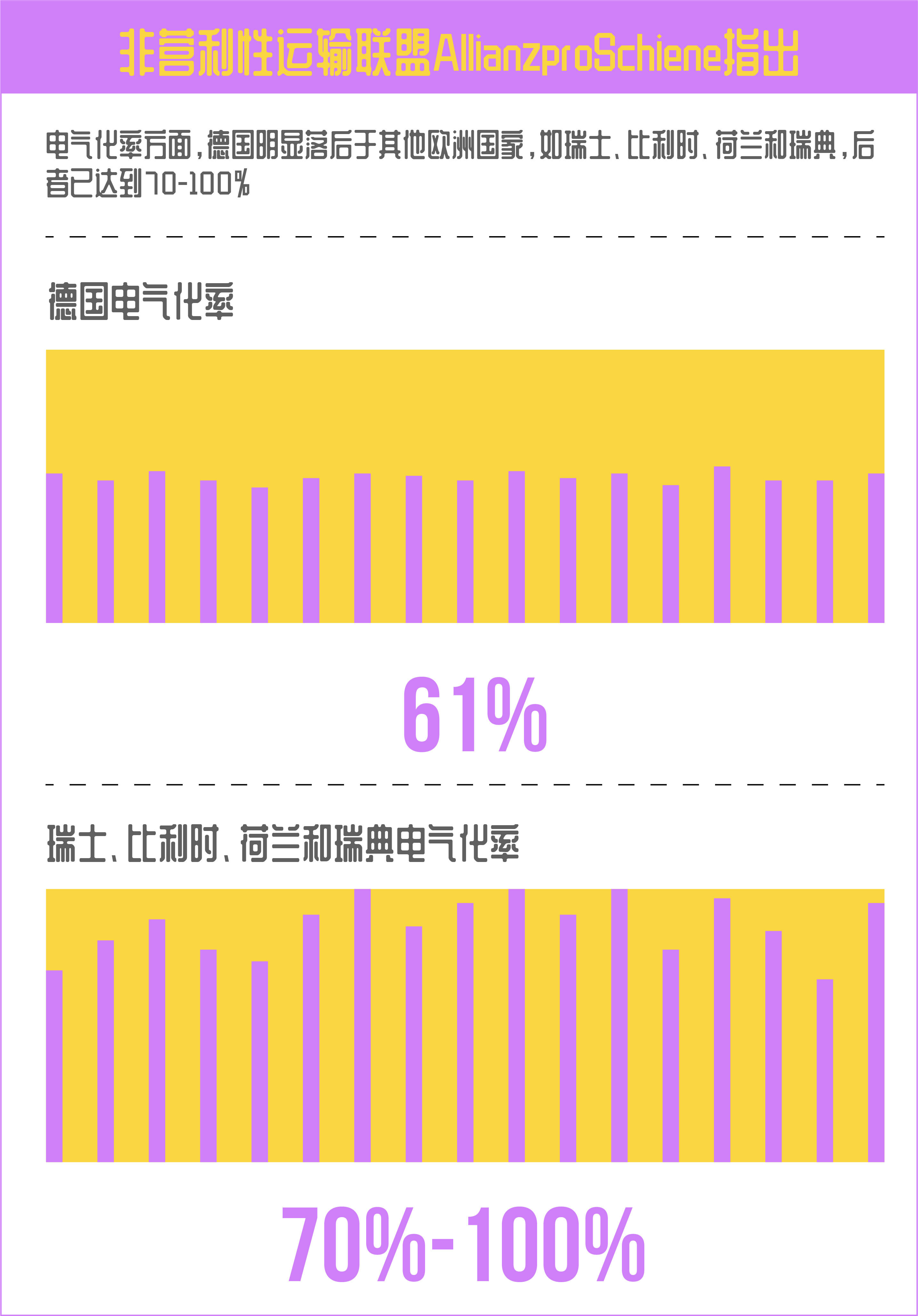 在铁路网络电气化方面,德国落后于欧洲其他国家。这是根据非营利性运输联盟AllianzproSchiene的说法,该联盟指出,在61%的电气化率方面,德国明显落后于其他欧洲国家,如瑞士、比利时、荷兰和瑞典,后者已达到70-100%。