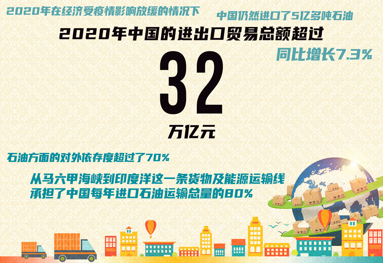 随着中国经济的迅猛发展,大量的进出口贸易尤其是能源进口都严重依赖海上运输,据海关总署公布的数据显示,2020年在经济受疫情影响放缓的情况下,中国仍然进口了5亿多吨石油,同比增长7.3%,创造了历史新高,在石油方面的对外依存度超过了70%,从马六甲海峡到印度洋这一条货物及能源运输线,承担了中国每年进口石油运输总量的80%,2020年中国的进出口贸易总额超过了32万亿元,这其中相当大一部分商品货物的运输也要途径该区域。