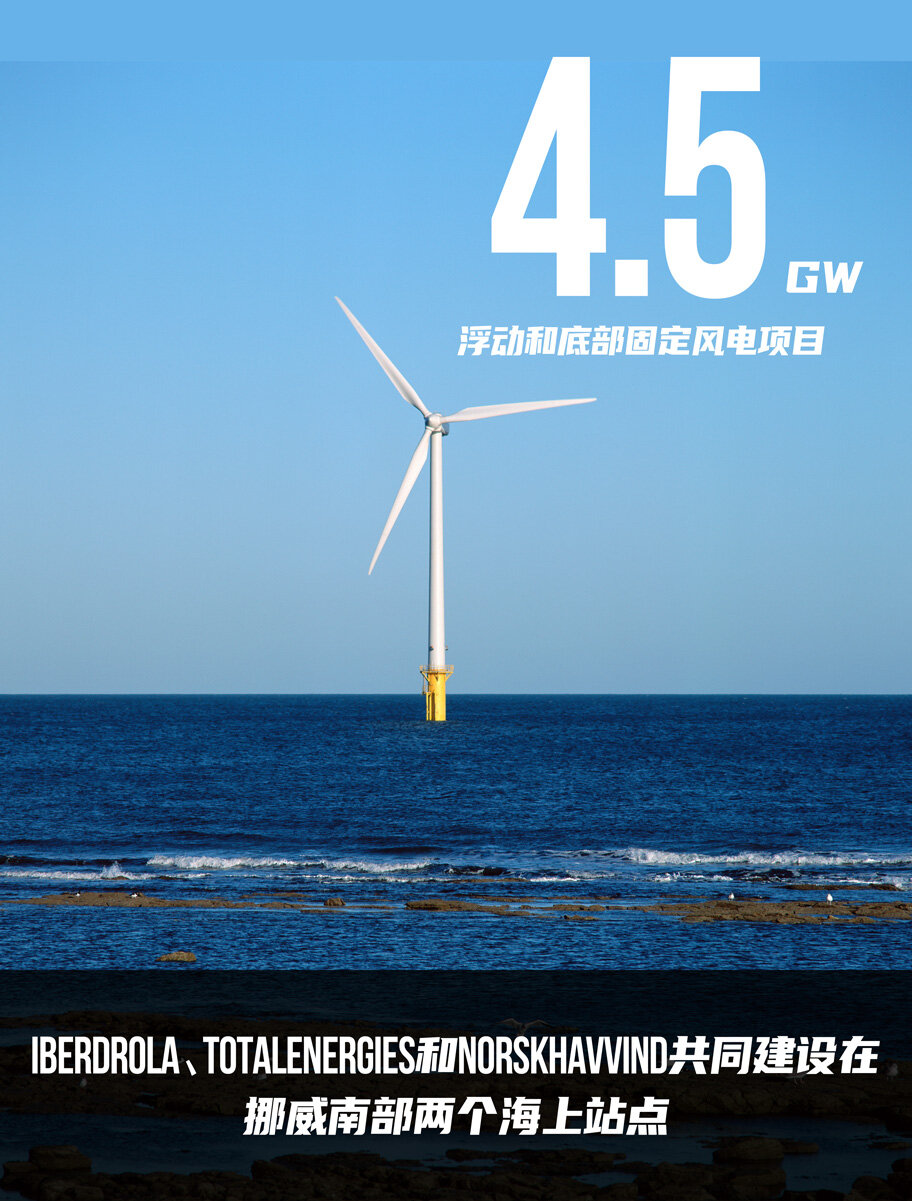 Iberdrola、TotalEnergies和NorskHavvind共同建设在挪威南部两个海上站点,开发累计容量为4.5GW的浮动和底部固定风电项目。该联合体表示,将利用其成员在底部固定式和浮动式海上风电方面的成熟技术,以及对挪威面临的挑战、领土和利益相关者。