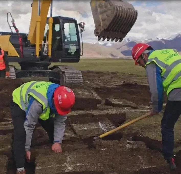 羌塘草原,千年未被污染,这里是牦牛、虫草、牧民赖以生存的地方,破坏一片草原等于毁了牧民的生计,项目始终将环保放在首位,创新研发草皮移植技术给草皮搬家。