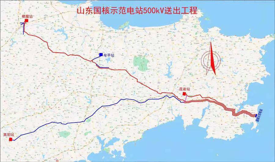 国核示范电站500千伏送出工程,全长501公里,铁塔657基,途径威海、烟台市。项目包括国核示范电站~昆嵛500千伏线路工程、国核示范电站~莱阳500千伏线路工程、国核示范电站~栖霞500千伏线路工程、昆嵛500千伏变电站间隔扩建工程、栖霞500千伏变电站间隔扩建工程、莱阳500千伏变电站保护改造工程、光州500千伏变电站保护改造工程。