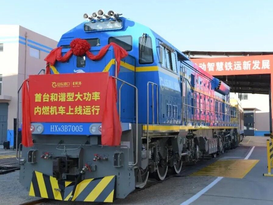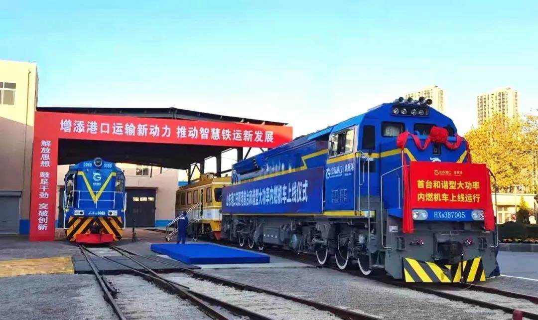 近日, 山东港口日照港首台和谐型大功率内燃机车上线仪式在日照港集团铁路运输公司举行,这是中车大连公司和谐型大功率内燃调车机车向路外市场推进的又一实践。