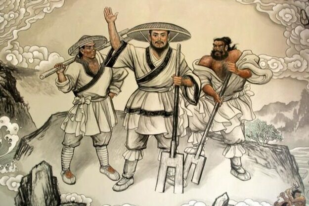 我们现在所能看到的最早、最著名的大禹画像,来自山东省嘉祥县武氏祠的大禹画像。画像出自汉代,画面上大禹留有短须,身体后倾,头冠呈三角形,类似过去普通农夫戴的斗笠,全身衣着朴素,左手平伸,右手拿着一个短柄工具。