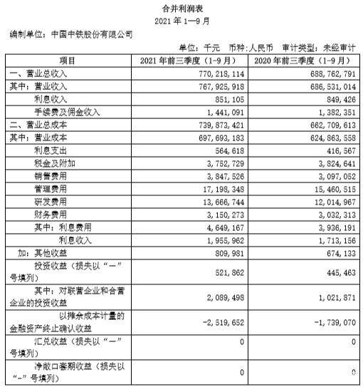 10月29日,中国中铁公布2021年第三季度主要经营数据。前三季度实现营业总收入 7702.18亿元,同比增长11.83%,其中:基础设施建设业务实现营业收入 6828.44 亿元,同比增长 12.83%;实现毛利率 7.87%,同比增加 0.62 个百分点。勘察设计与咨询服务业务实现营业收入 118.45 亿元,同比下降 4.68%;实现毛利率 24.48%,同比减少 3.06 个百分点。工程设备与零部件制造业务实现营业收入 187.97 亿元,同比增长 7.75%;实现毛利率 17.02%,同比减少 1.12 个百分点。房地产开发业务实现收入 218.59 亿元,同比下降 7.89%;实现毛利率 23.32%,同比减少 6.10 个百分点。