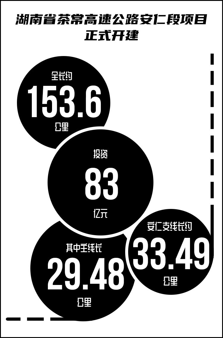 该项目总长153.655公里,在安仁县境内路线长62.979公里,投资约83亿元,其中主线长29.48公里,经过安仁县牌楼乡、灵官镇、安平镇、华王乡;安仁支线长33.499公里,经龙市乡、永乐江镇、洋际乡、灵官镇,在华王乡石鼻村与主线相接,全线按照双向四车道高速公路标准设计,计划工期3年。关键词:交通项目建设、基建资讯