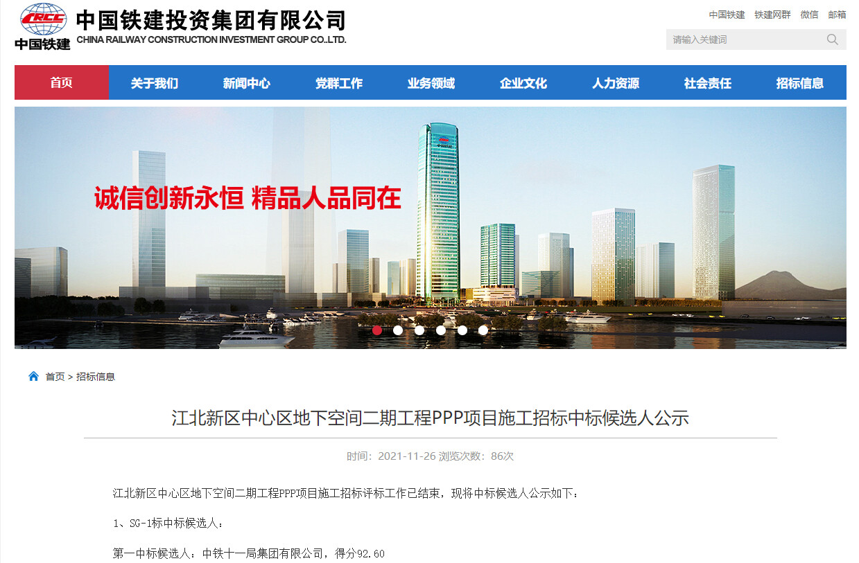 2021年11月26日,中国铁建投资集团有限公司发布公告,江北新区中心区地下空间二期工程PPP项目施工中标发榜,中铁十八局、中铁十一局、中国铁建大桥工程局中标南京大项目,估算建安费为104亿元。
