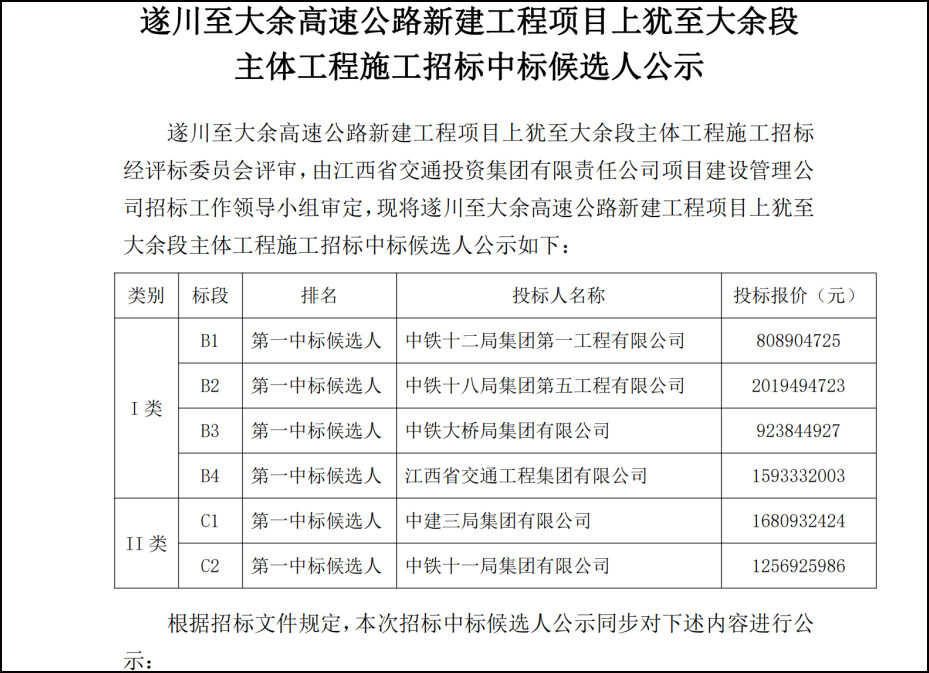 On November 29, 2021, the Jiangxi Provincial Public Resources Trading Center announced that the construction of the main project of the Suichuan-Dayu Expressway project from Shangyou to Dayu section won the bid. Yu high-speed construction project!