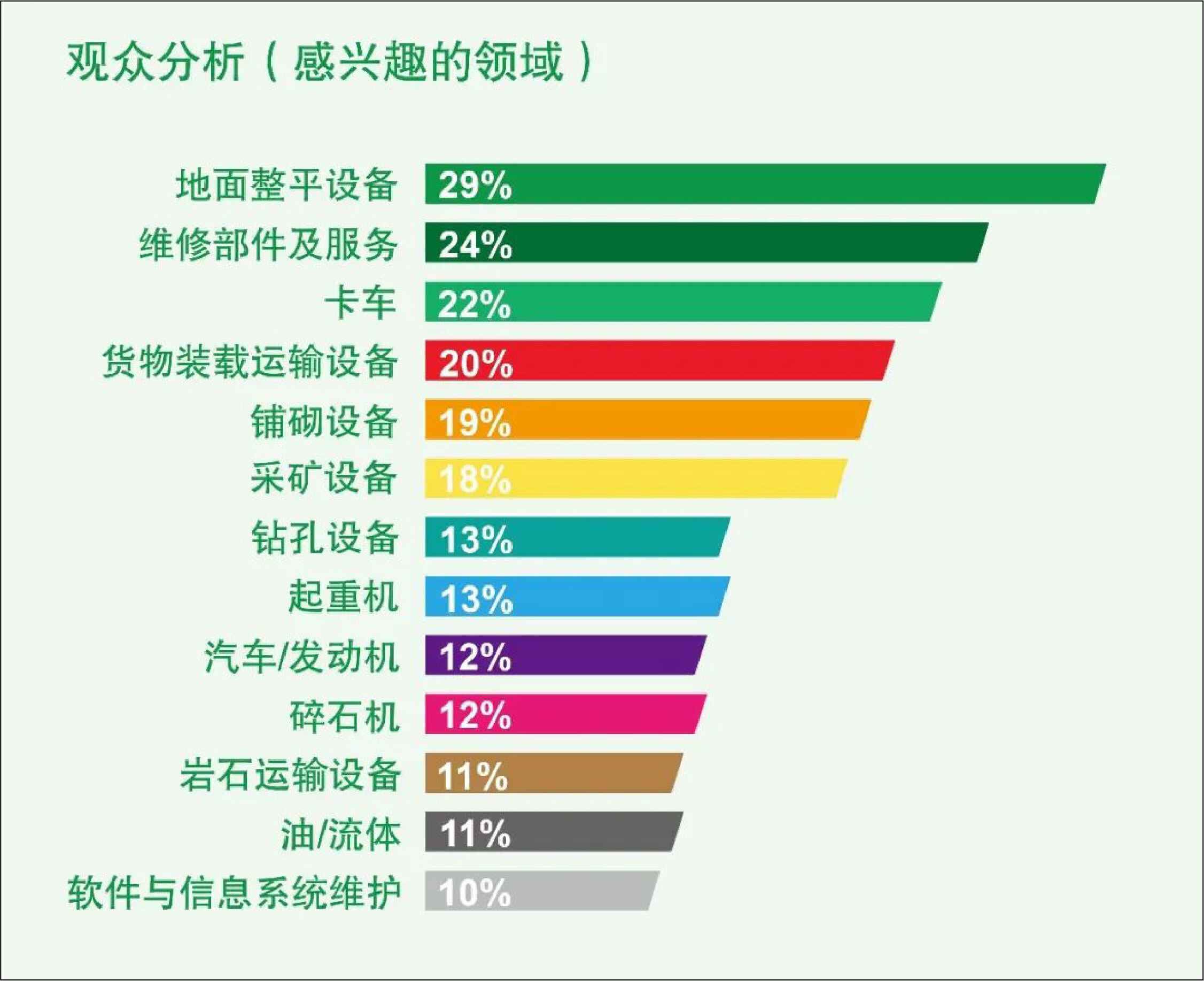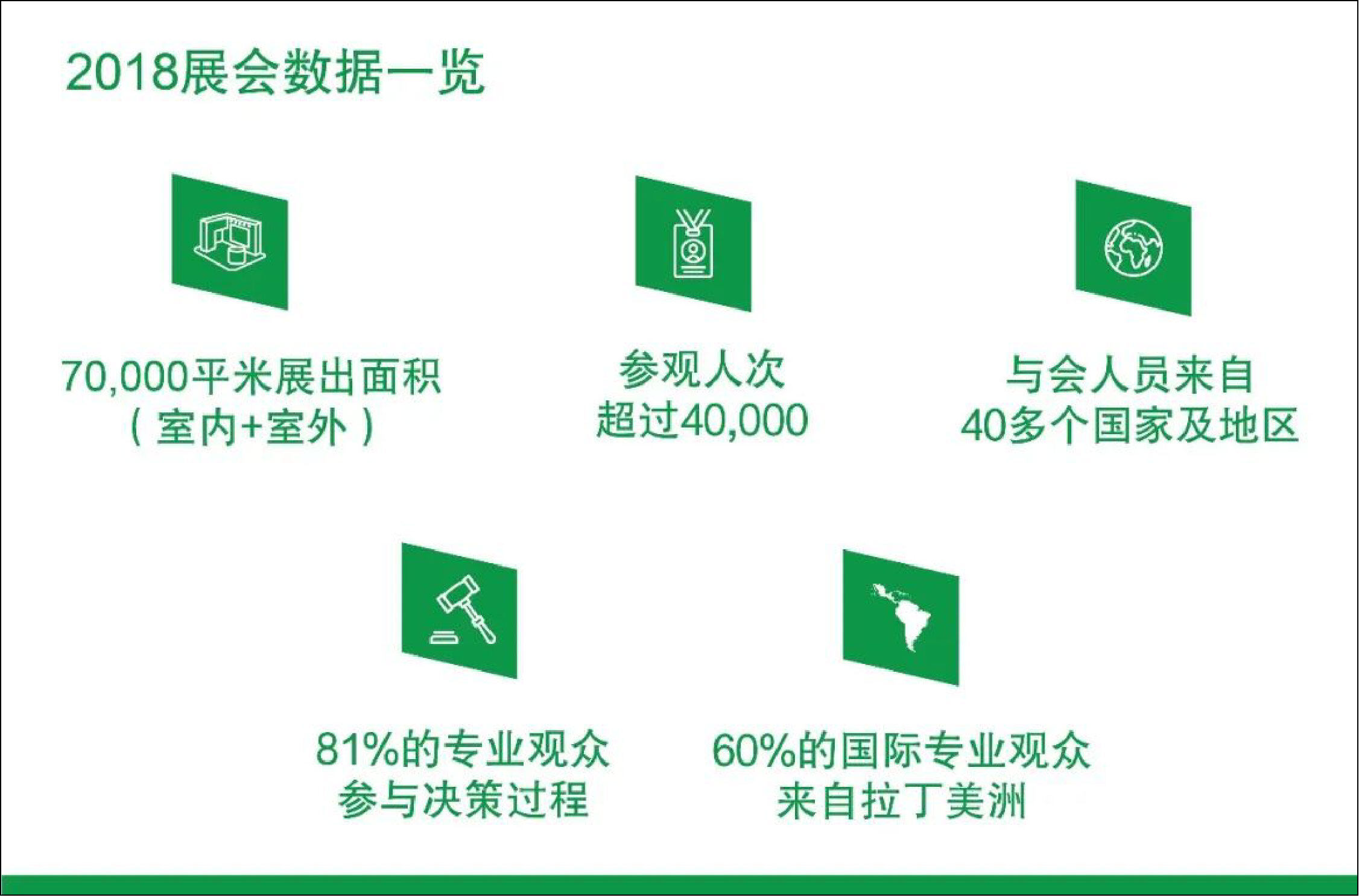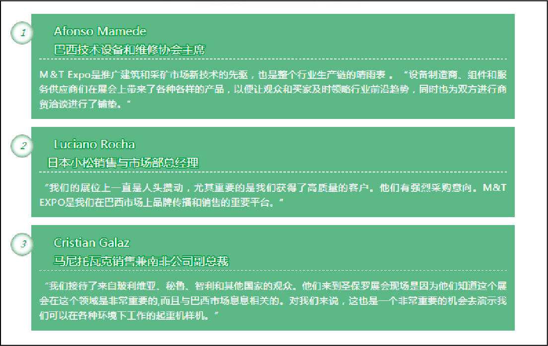 共享商机:M&TEXPO因充满商业机遇而被广泛认可。2018年,达成了27亿雷亚尔的商业交易。参观商期待展会展出更多的新产品、新技术。全球机遇:M&TEXPO是拉丁美洲建筑及施工领域的知名盛会,参观商来自全球各个地区,期待在这里找到所需的设备和机器。改革与创新:M&TEXPO是一个完美的平台,制造商可以展示各类的创新技术和产品。精准展区划分:展会划分为4个板块,帮助潜在买家轻松定位目标展商。汇聚一堂:多达40,000名高质量专业观众,帮您扩大“朋友圈”。影响市场的新观点:通过展会期间的各类会议,向参会的决策者传递专业技术信息。三年一次的难得机遇:除了在这个绝佳的时机展示您的品牌并推出商业活动外,下一届的M&TEXPO只能等到2024年。千万不要错失您在2022年的参展机遇。bauma全球系列展的主要组成部分:M&TEXPO是享誉全球的建筑设备、采矿设备国际盛会baumaNETWORK的重要组成部分,连接着来自各大洲的参展商和全球买家。产品演示与买家互动:大面积的户外活动空间,参展商可以现场演示设备和模拟使用环境。这也是吸引潜在客户的绝佳方式。