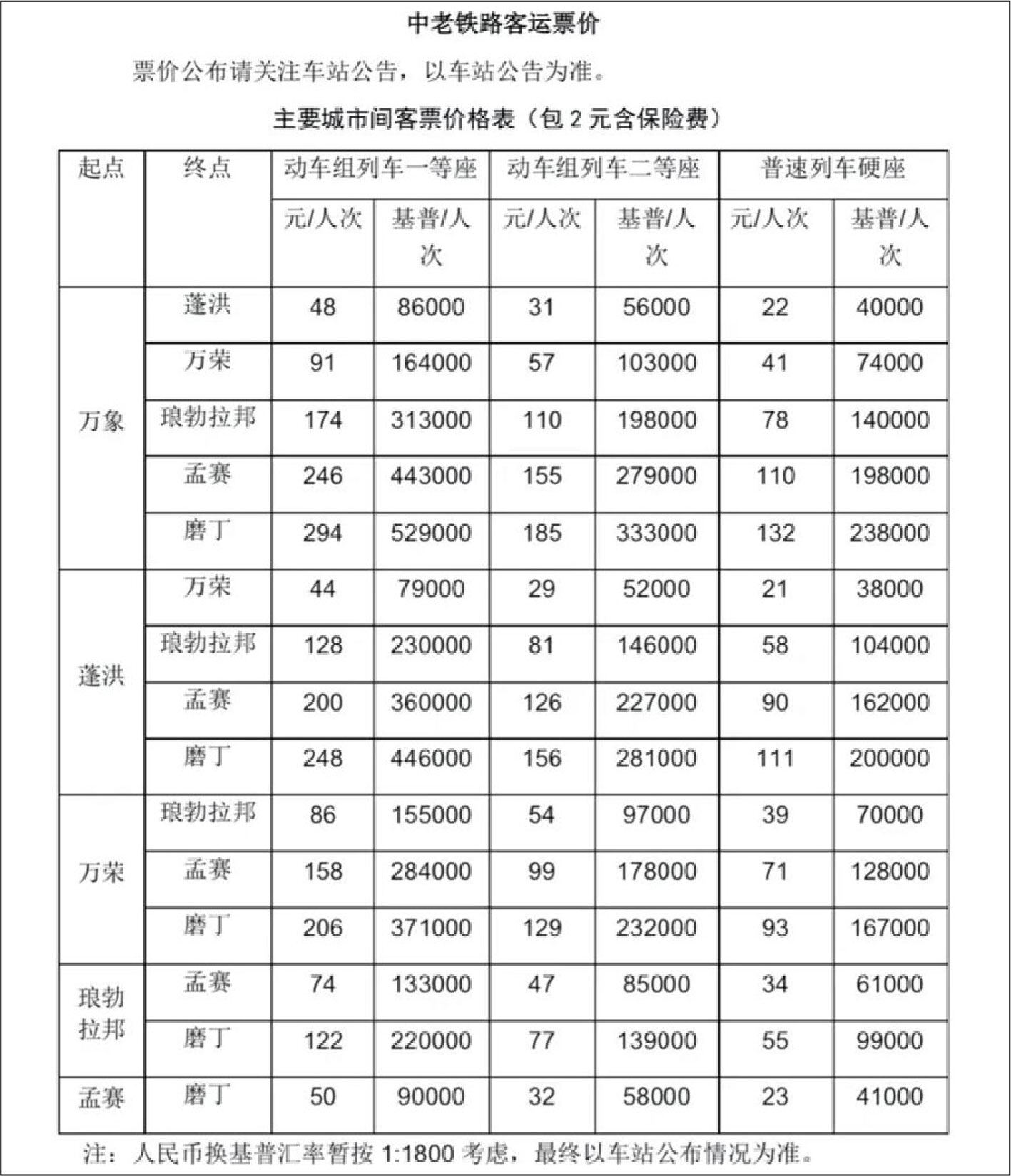 老挝政府当地时间11月30日对外公布,将对12月3日正式开通运营的中老铁路老挝段列车实行试行票价。其中,始发站万象站至终点站磨丁站的普客票价仅需132元(均为人民币计价)。