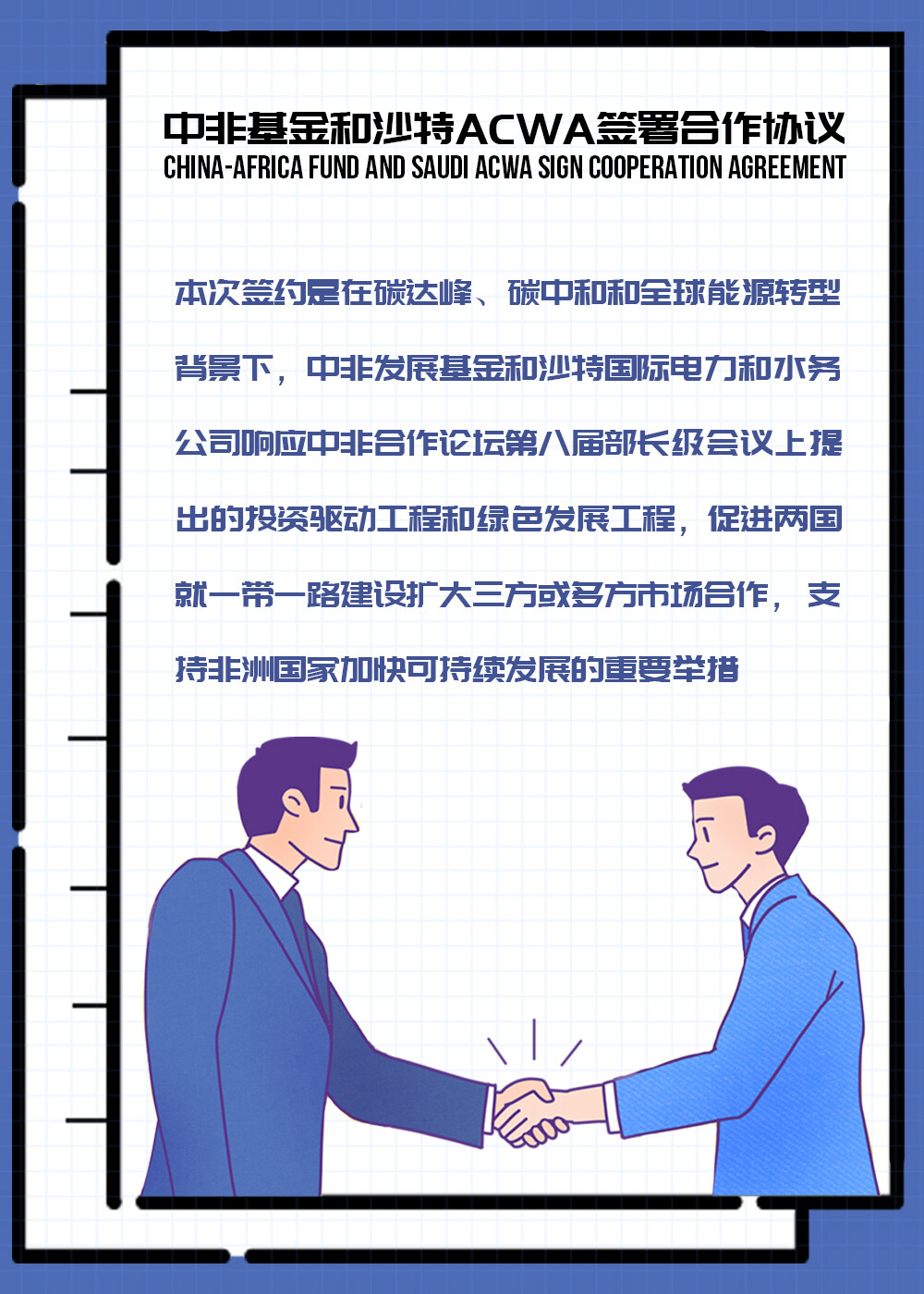 中非发展基金与沙特国际电力和水务公司(ACWA Power)2021年11月30日在京签署《关于在非洲开展电力项目投资合作之合作备忘录》。中非发展基金董事长宋磊、沙特国际电力和水务公司副总裁兼中国首席代表吕云鹤代表双方在合作备忘录上签字。