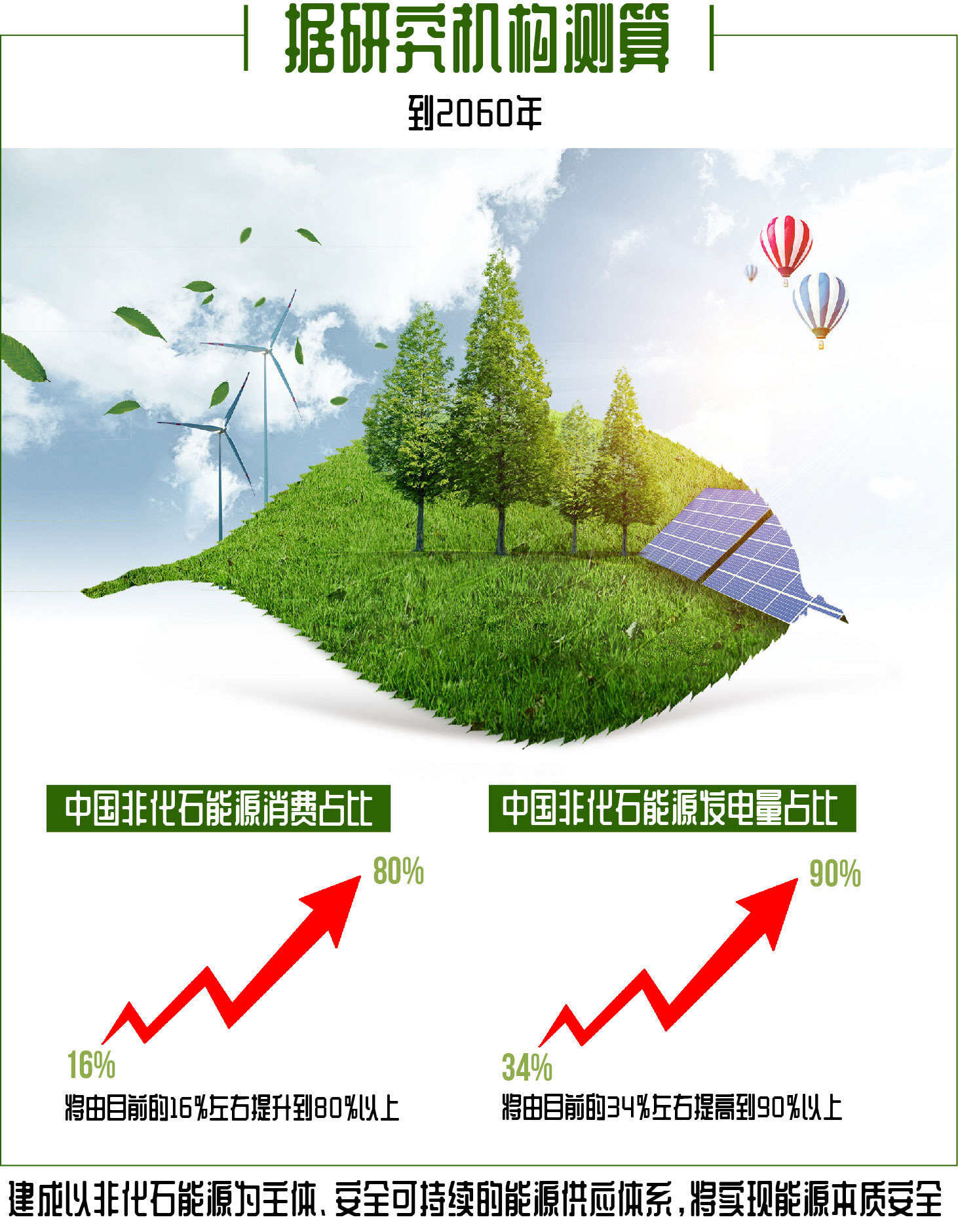 随着能源清洁低碳转型深入推进,中国将逐步摆脱对煤炭、石油等化石能源的依赖。据研究机构测算,到2060年,中国非化石能源消费占比将由目前的16%左右提升到80%以上,非化石能源发电量占比将由目前的34%左右提高到90%以上,建成以非化石能源为主体、安全可持续的能源供应体系,将实现能源本质安全。
