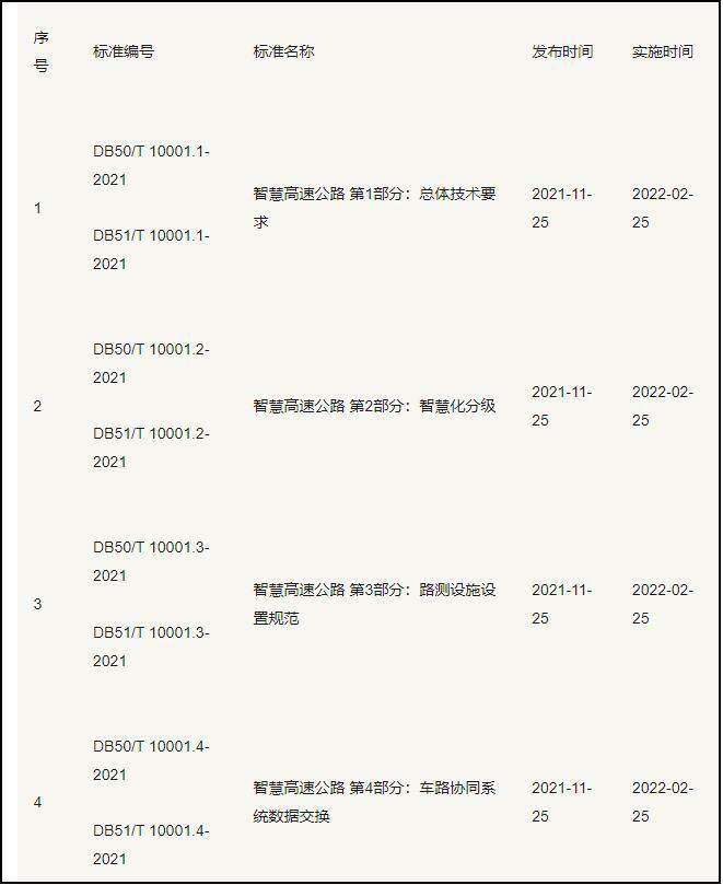 此次联合发布的智慧高速公路系列地方标准,包括总体技术要求、智慧化分级、路测设施设置规范、车路协同系统数据交换4项标准,从技术角度分别回答了智慧高速公路“是什么”“建什么”“怎么建”“怎么用”的问题,有利于川渝两地进一步实现互联互通。