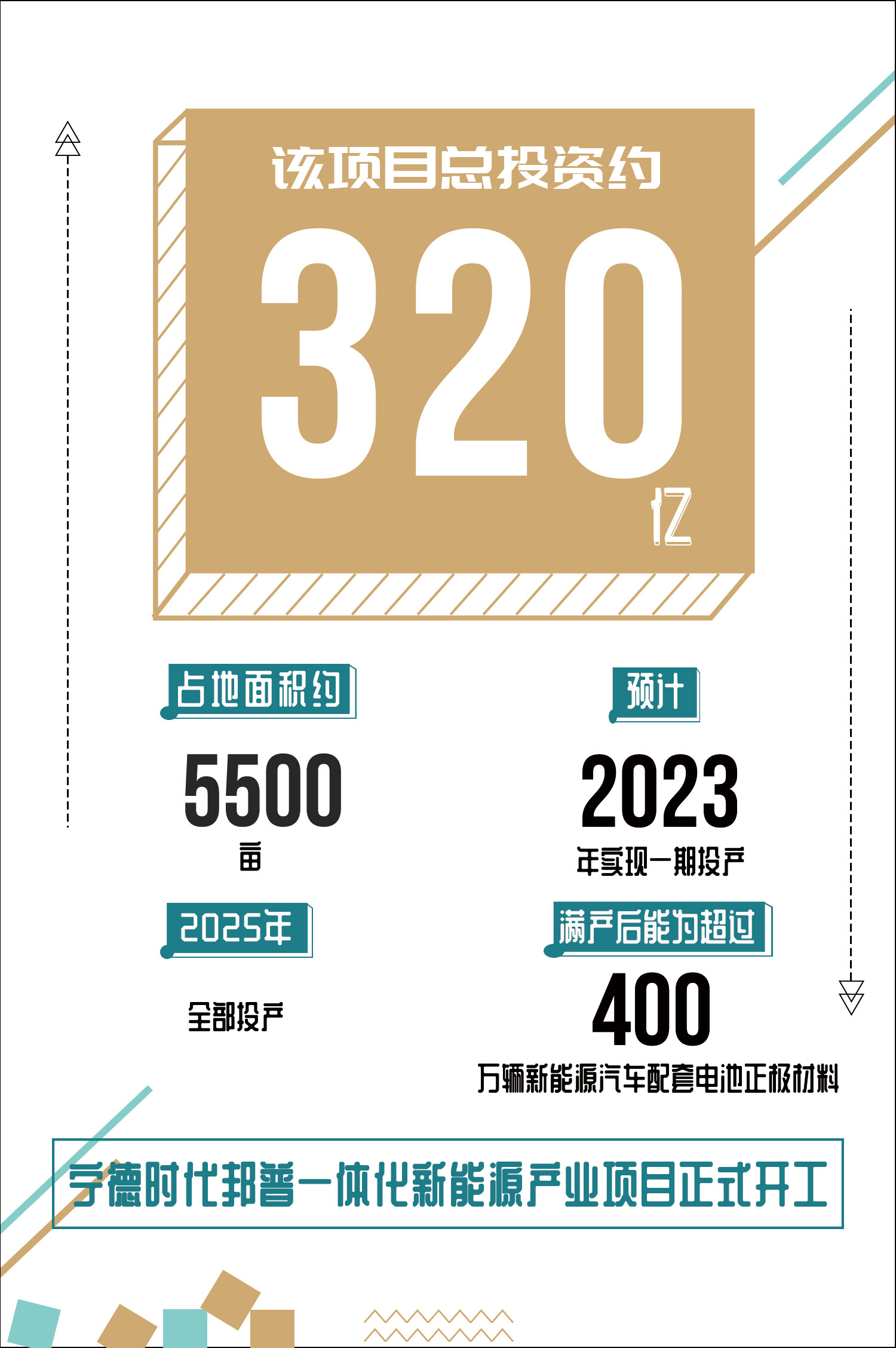 该项目总投资约320亿元,占地面积约5500亩,规划建设年产36万吨磷酸铁、22万吨磷酸铁锂、18万吨三元前驱体及材料、4万吨钴酸锂、4万吨再生石墨和30万吨电池循环利用的超大规模生产基地。预计2023年实现一期投产,2025年全部投产,满产后能为超过400万辆新能源汽车配套电池正极材料。
