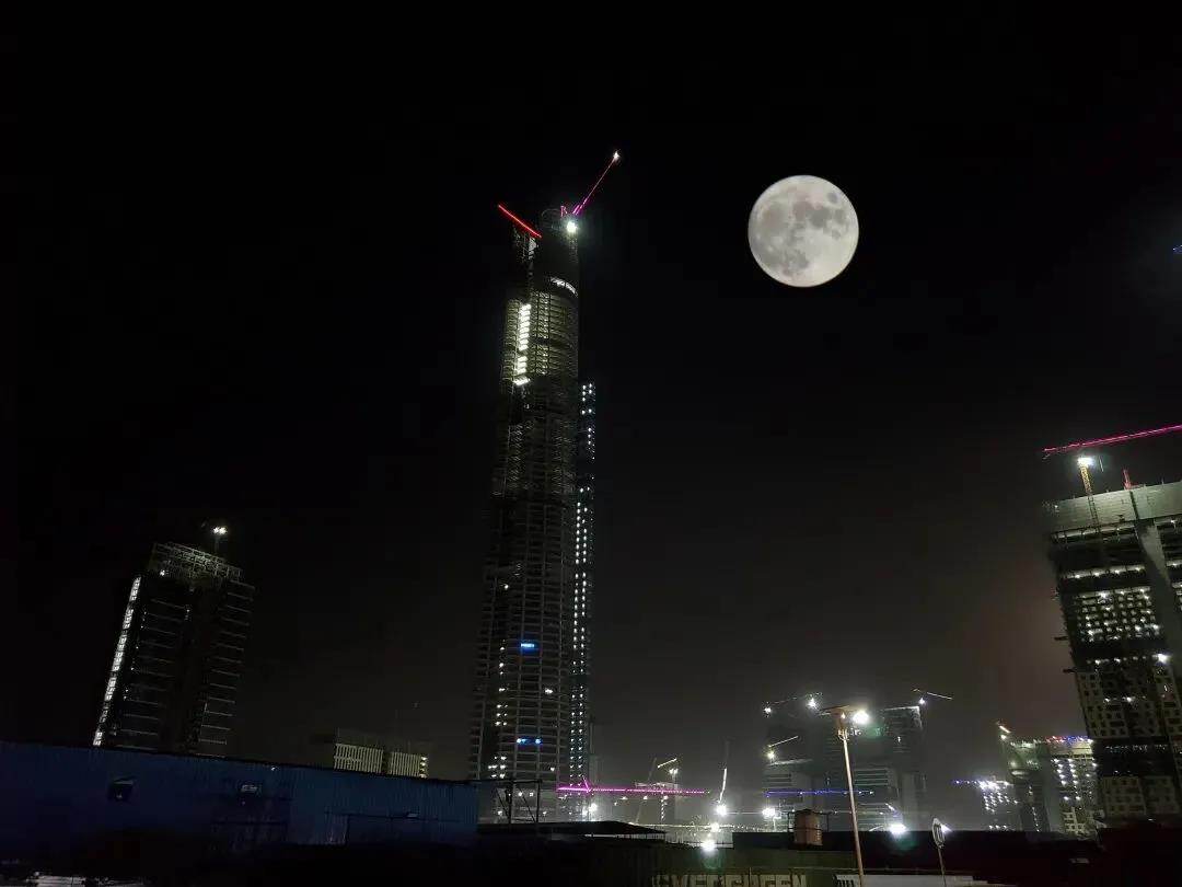 2019年11月16日,重达 26.8 吨的首根钢管柱被高耸的动臂式塔吊缓缓吊起,嵌入L01 层的混凝土基座,标志塔钢结构工程首次吊装成功,由此进入大规模钢结构施工阶段。