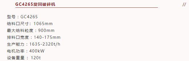 The GC4265 gyratory crusher of Nanchang Mining Machine applies international advanced crushing technology and high-efficiency and energy-saving design concepts. It has the characteristics of large processing capacity, high crushing efficiency, large crushing ratio, uniform product size, low energy consumption, and uniform wear in the crushing cavity. It is suitable for use under larger production scale conditions.