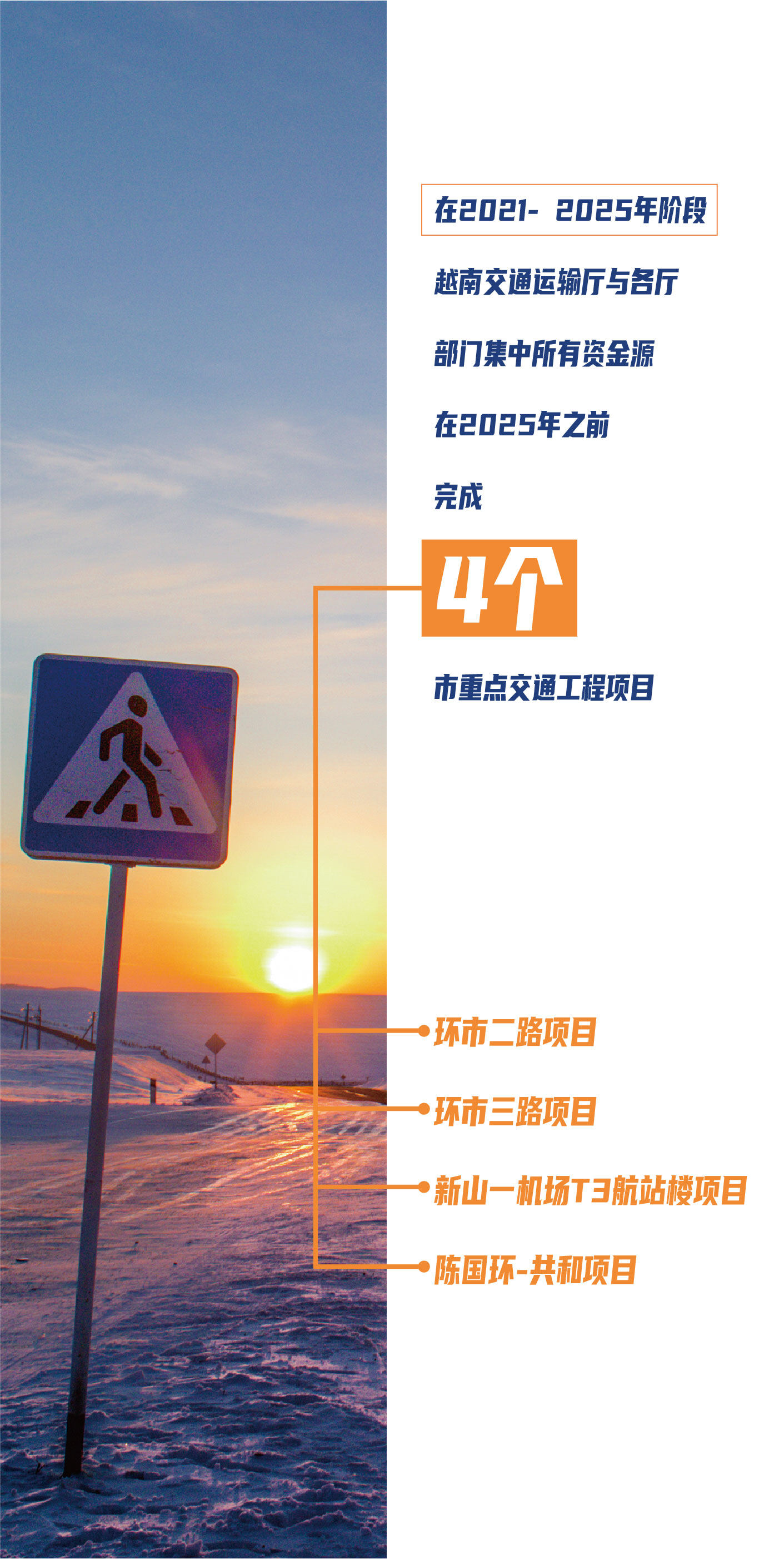 越南胡志明市人委会确定环市二路、环市三路、新山一机场T3航站楼、陈国环-共和项目是本市重点交通工程。据此,在2021- 2025年阶段,越南交通运输厅与各厅、部门集中所有资金源以在2025年之前完成上述4个项目。
