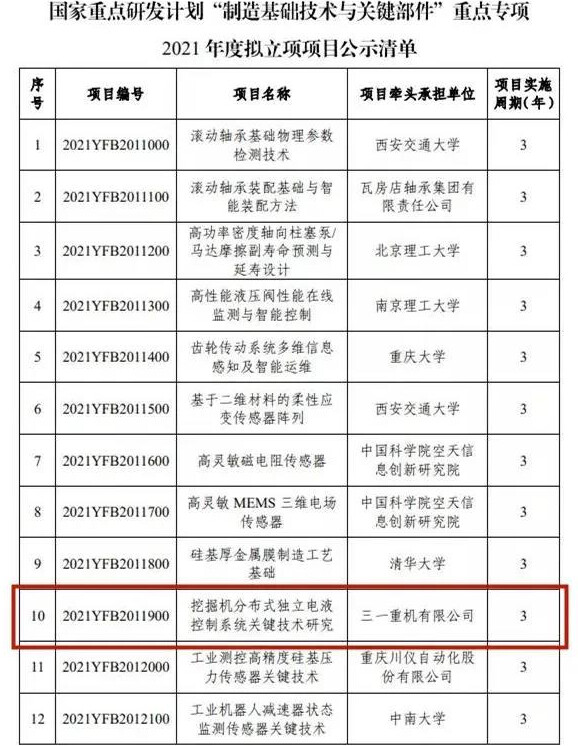 Recently, the Ministry of Science and Technology released the project information of the 2021 key special project of the national key research and development plan "Manufacturing Basic Technology and Key Components". Sany Heavy Machinery Co., Ltd. was successfully selected by virtue of the project "Research on Key Technologies of Distributed Independent Electro-hydraulic Control System for Excavators". Only 2 projects in Jiangsu Province were selected, and Sany Heavy Machinery Zone was the only one.