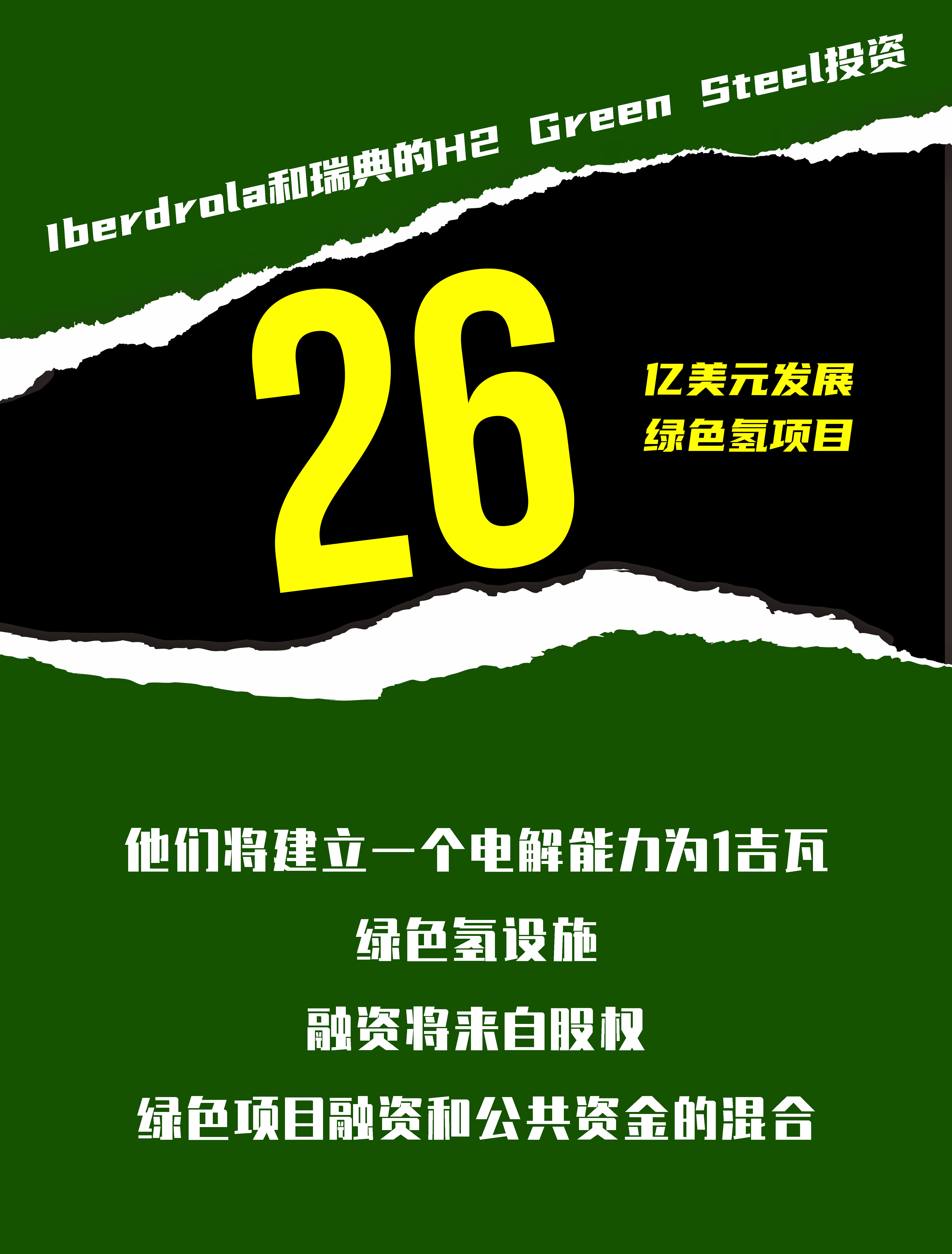 西班牙电力公司Iberdrola和瑞典的H2 Green Steel将合作开发一个生产绿色氢气的主要设施,两家公司表示,在这个23亿欧元(26亿美元)的项目中,他们将建立一个电解能力为1吉瓦的绿色氢设施。融资将来自股权、绿色项目融资和公共资金的混合。