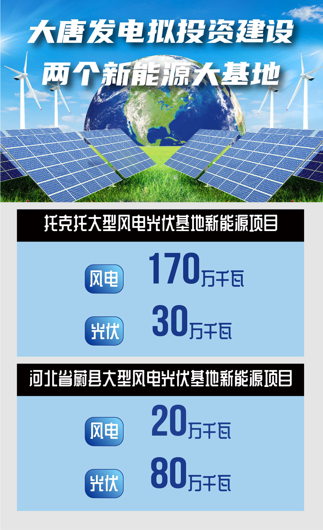 大唐发电拟投资建设两个新能源大基地,两个项目的装机规模都很可观。大唐发电这两个风光大基地项目,都配套了大型火电厂作为调峰电源。托克托大型风电光伏基地新能源项目,包括风电170万千瓦,光伏30万千瓦;河北省蔚县大型风电光伏基地新能源项目,包括风电20万千瓦,光伏80万千瓦。