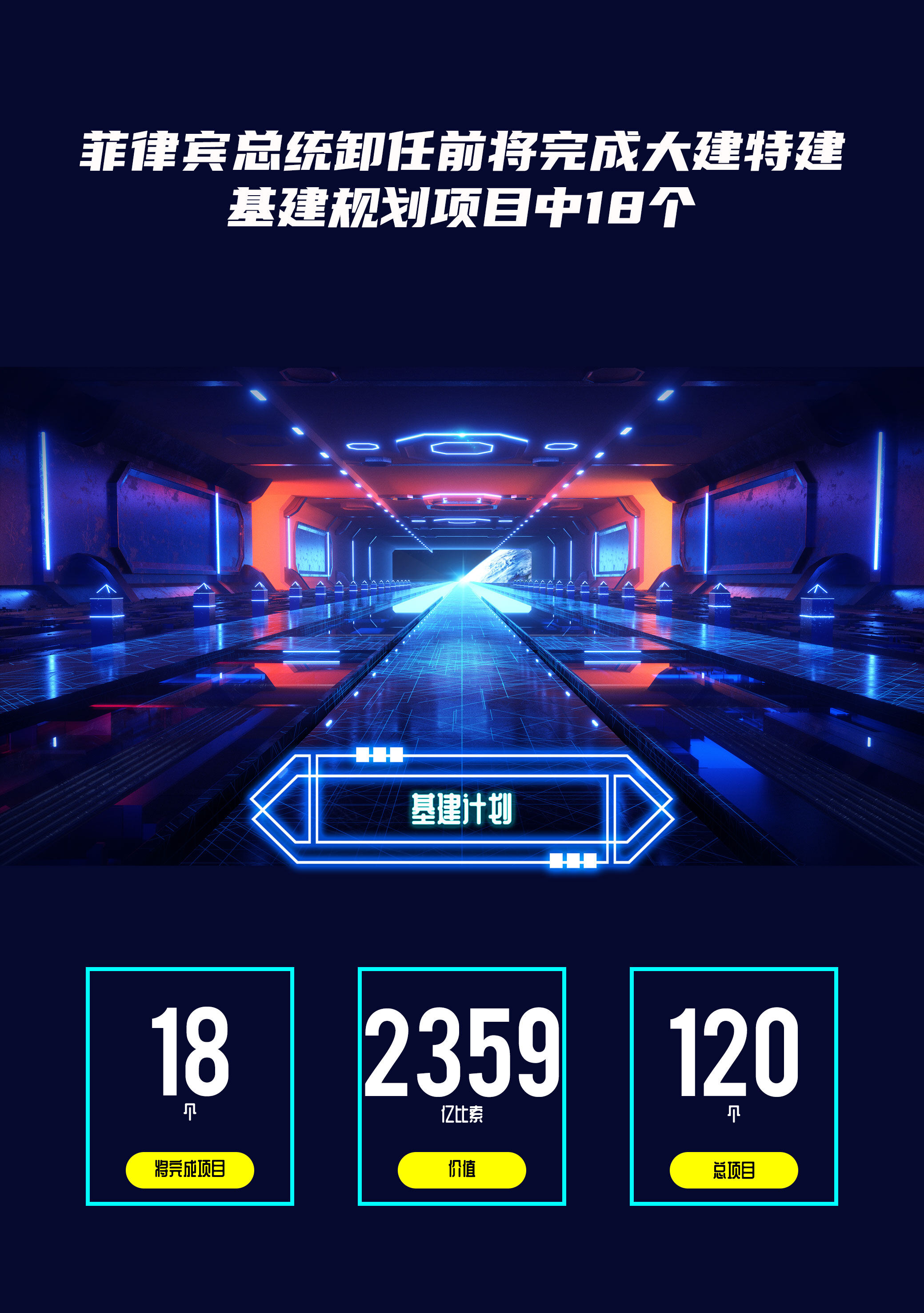 菲国家经济发展署副署长乔纳森表示,到2021年底,政府至少将完成总值1161亿比索的14个项目,到2022年6月,预计将完成另外4个总值1198亿比索的项目。政府4.7万亿比索计划中的112个“大建特建”基础设施项目中的大部分将在杜特尔特总统任期结束后完成。他希望下一届政府能够继续完成“大建特建”项目中总值4.5万亿比索的94个项目。2022年下半年预计将完成9个项目,还有85个项目预计将在2023年之后完成。