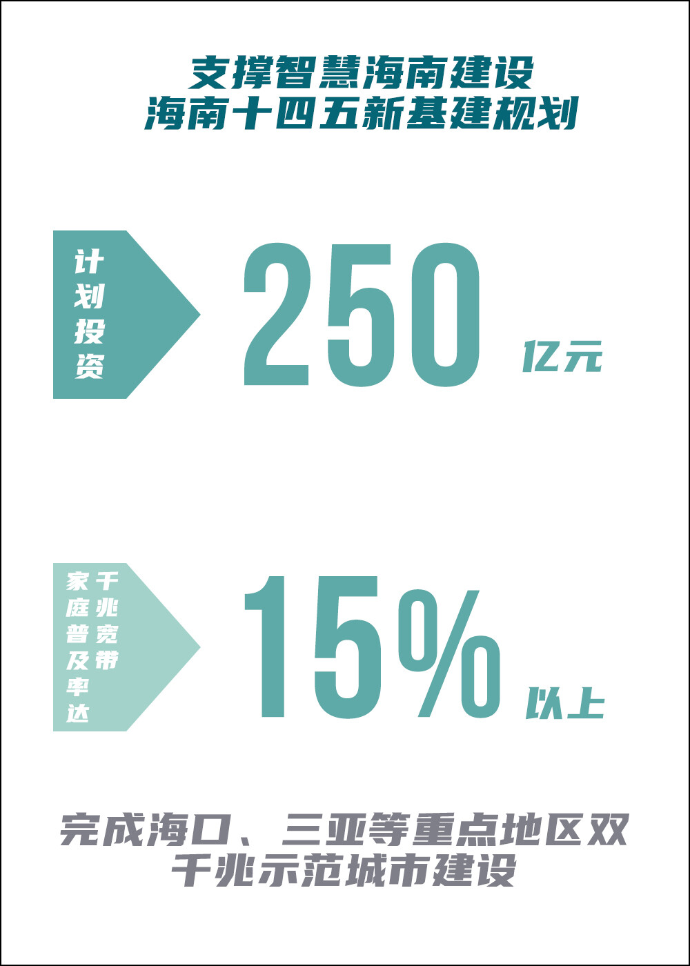 其中2023年阶段性目标将围绕海南自贸港封关运作及“一线放开,二线管住”的工作要求,按照工信部“双千兆”网络协同发展计划,全力推进信息基础设施提质升级。2025年规划期目标为:“十四五”期间,海南省将围绕全面支撑“智慧海南”建设的发展主线,预计累计投资250亿元,打造“全千兆自贸港”。