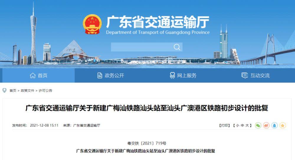 近日,广东省交通运输厅发布《关于新建广梅汕铁路汕头站至汕头广澳港区铁路初步设计的批复》。