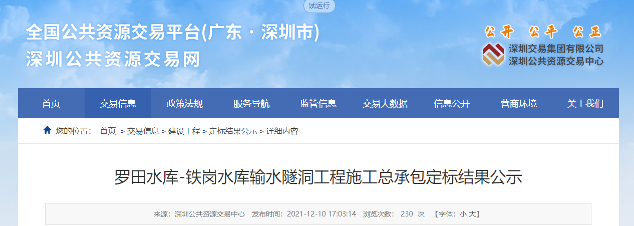 2021年12月10日,深圳公共资源交易中心发布罗田水库-铁岗水库输水隧洞工程施工总承包中标公示,中电建生态环境集团有限公司、中国水利水电第十四工程局有限公司联合体42.9亿中标项目。