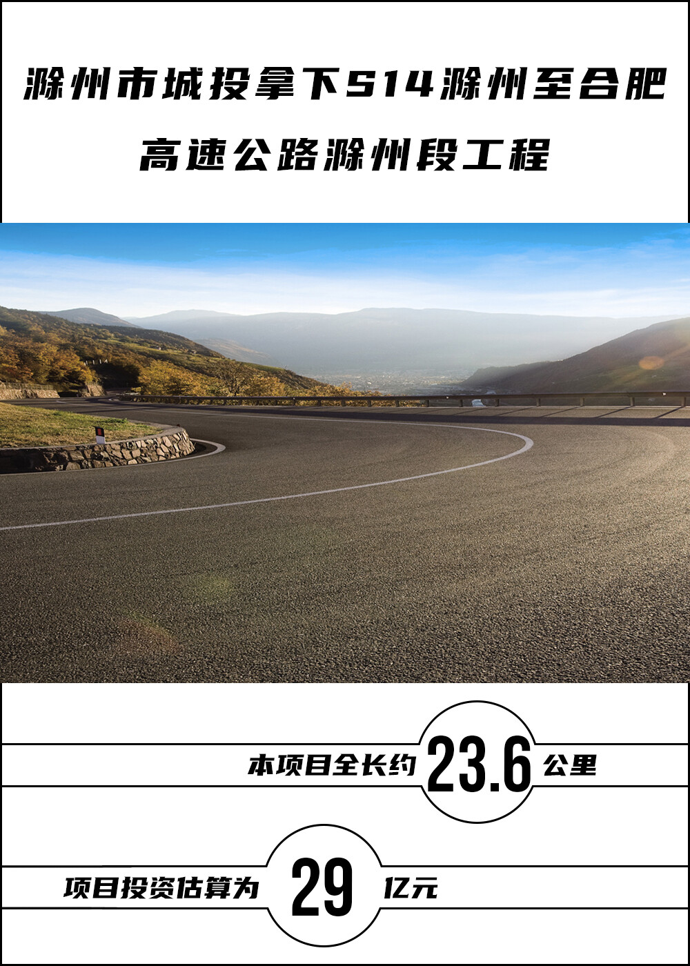 2021年12月10日,滁州市公共资源交易中心发布S14滁州至合肥高速公路滁州段工程特许经营项目中标公示,滁州市城投交通控股有限公司拿下该项目,项目投资估算29.6亿元。