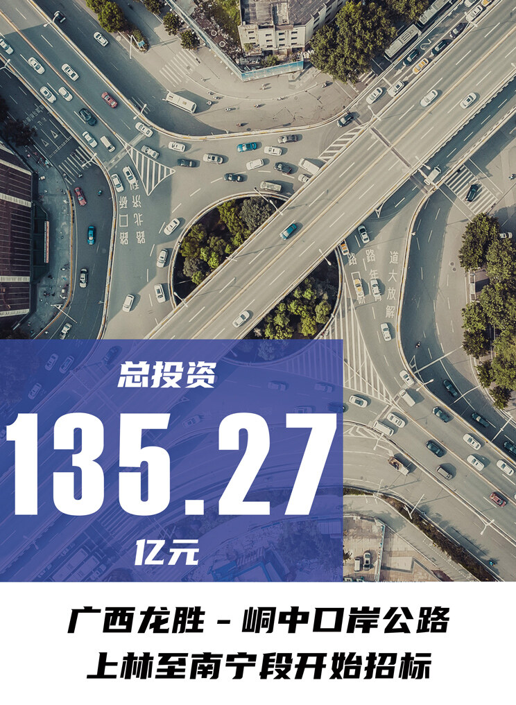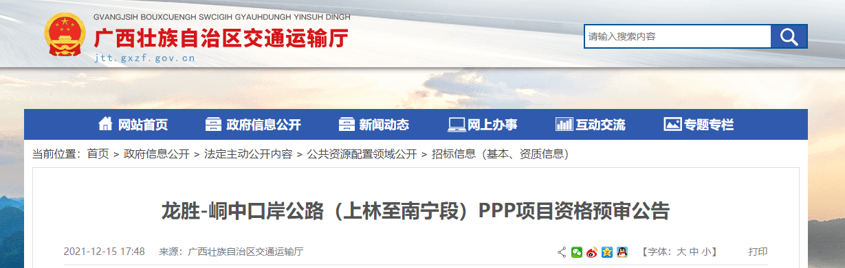 2021年12月15日,广西壮族自治区交通运输厅发布龙胜-峒中口岸公路(上林至南宁段)PPP项目资格预审公告,招标人广西壮族自治区交通运输厅,项目总投资估算约为135.27亿元。