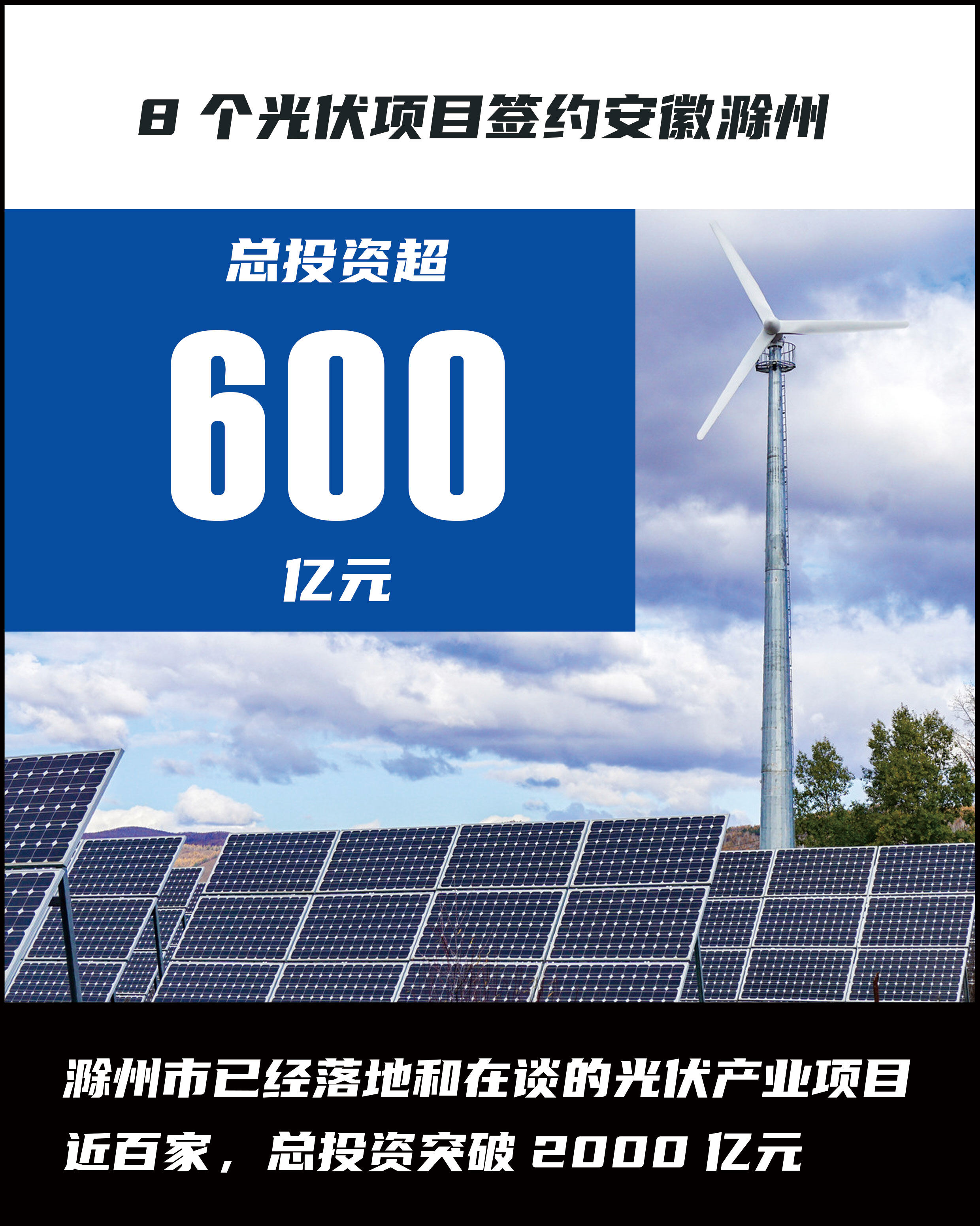 2021年12月15日,中国光伏行业年度大会暨(滁州)光伏创新发展高峰论坛在安徽滁州举行。其中,滁州市政府于会上共签约光伏产业重大招商引资项目8个,总投资超600亿元。滁州市光伏产业重大招商引资项目签约,分别是: