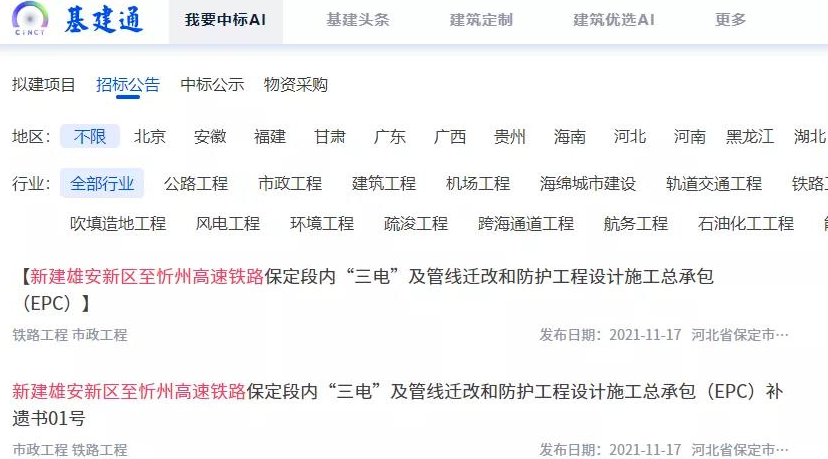 最新进展:2021年11月9日,河北省公共资源交易平台公布了《新建雄安新区至忻州高速铁路保定段内“三电”及管线迁改和防护工程设计施工总承包(EPC)》招标公告,预示着临近年底开工。