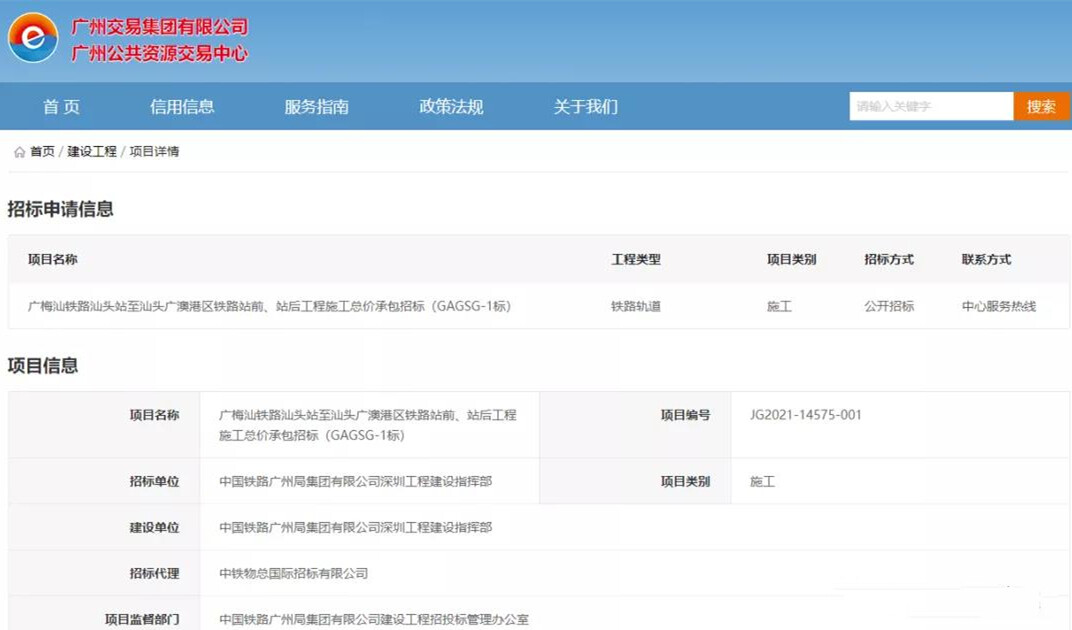 2021年12月17日,广州公共资源交易中心发布广梅汕铁路汕头站至汕头广澳港区铁路站前、站后工程施工总价承包招标公告,项目总投资约33.52亿元。