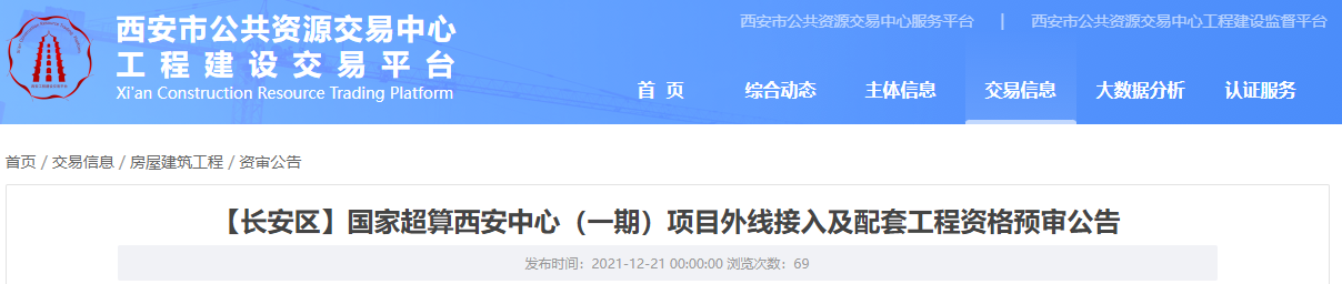 2021年12月21日,陕西省公共资源交易中心发布国家超算西安中心(一期)项目外线接入及配套工程招标公告,所属行业信息化,招标人西安航天新基建产业发展有限公司,项目总投资41亿。