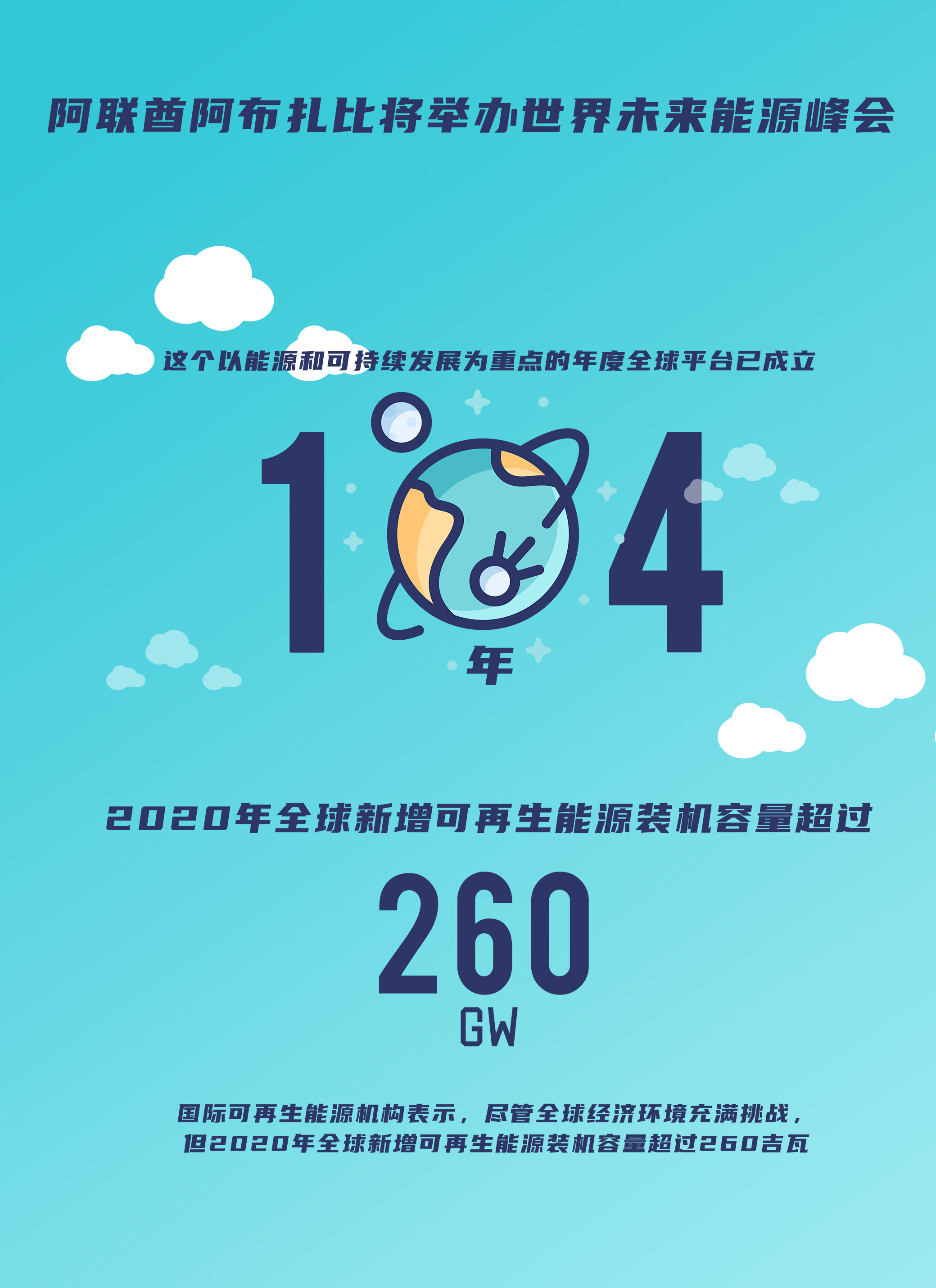 2021年,国际可再生能源机构表示,尽管全球经济环境充满挑战,但2020年全球新增可再生能源装机容量超过260吉瓦。在所有新增电力容量中,超过80%是可再生能源,其中太阳能和风能占总数的91%。该峰会是阿布扎比可持续发展周(ADSW)的一部分,由清洁能源公司Masdar主办。该活动分为阿布扎比和迪拜,部分内容将在2020年世博会上举行。