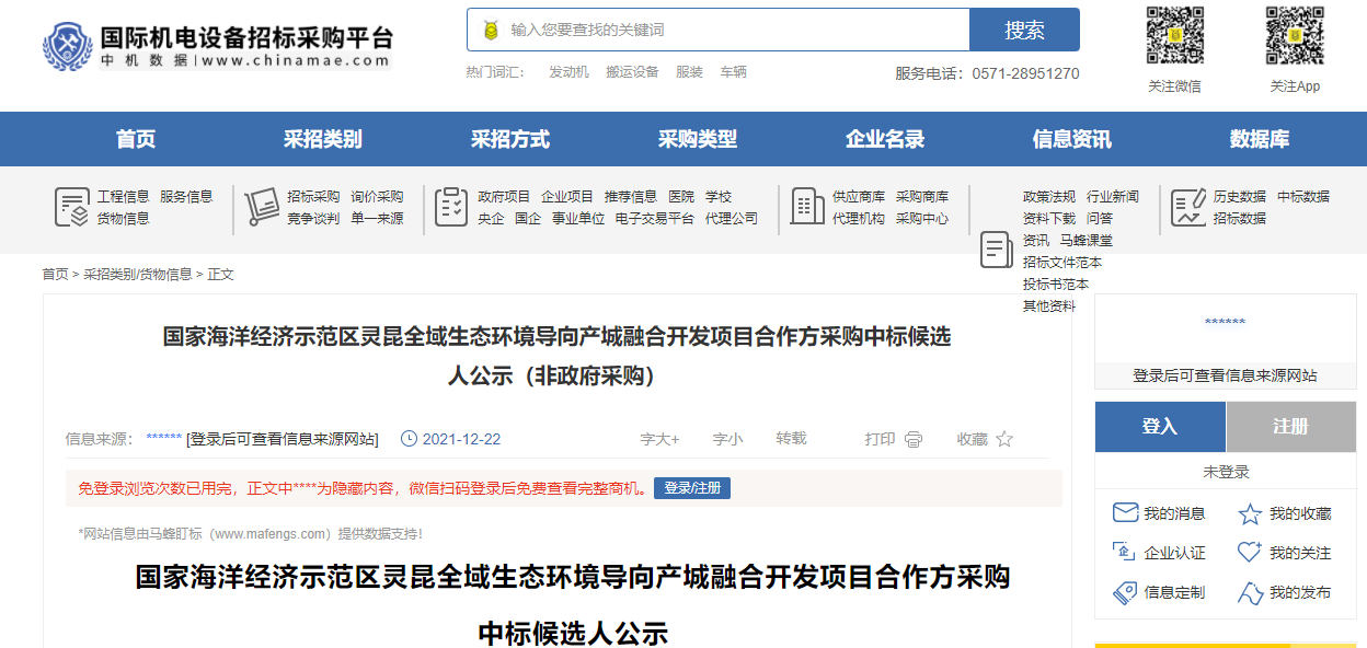 2021年12月22日,国际机电设备招标采购平台发布国家海洋经济示范区灵昆全域生态环境导向产城融合开发项目合作方采购中标候选人公示,中电建联合体拔得头筹,拿下该项目,项目总投资约410.5亿元。