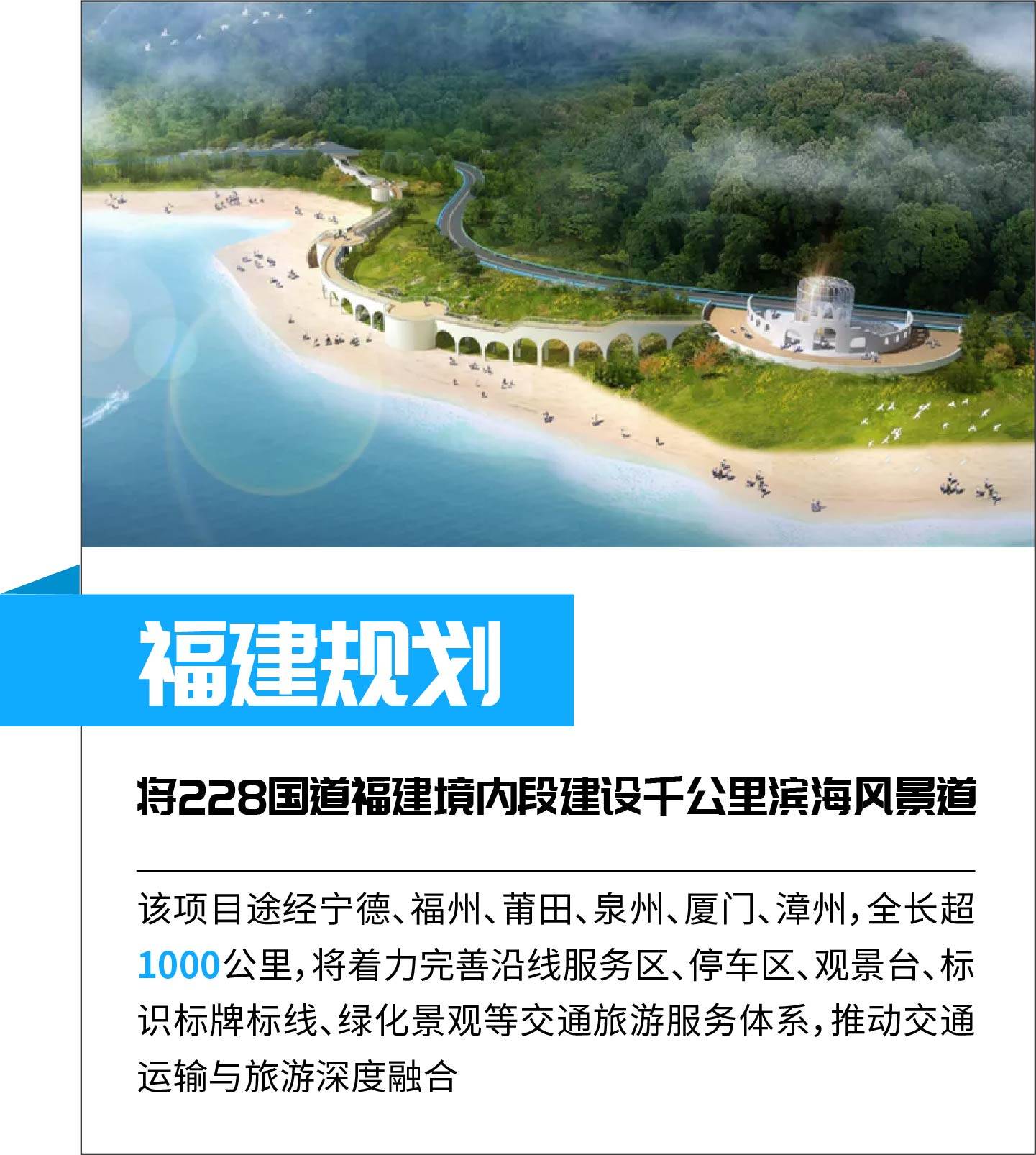 “十四五”期,228国道滨海风景道项目计划完成投资380亿元,待贯通路段将在2022年全部开工建设,到“十四五”末实现全线贯通。