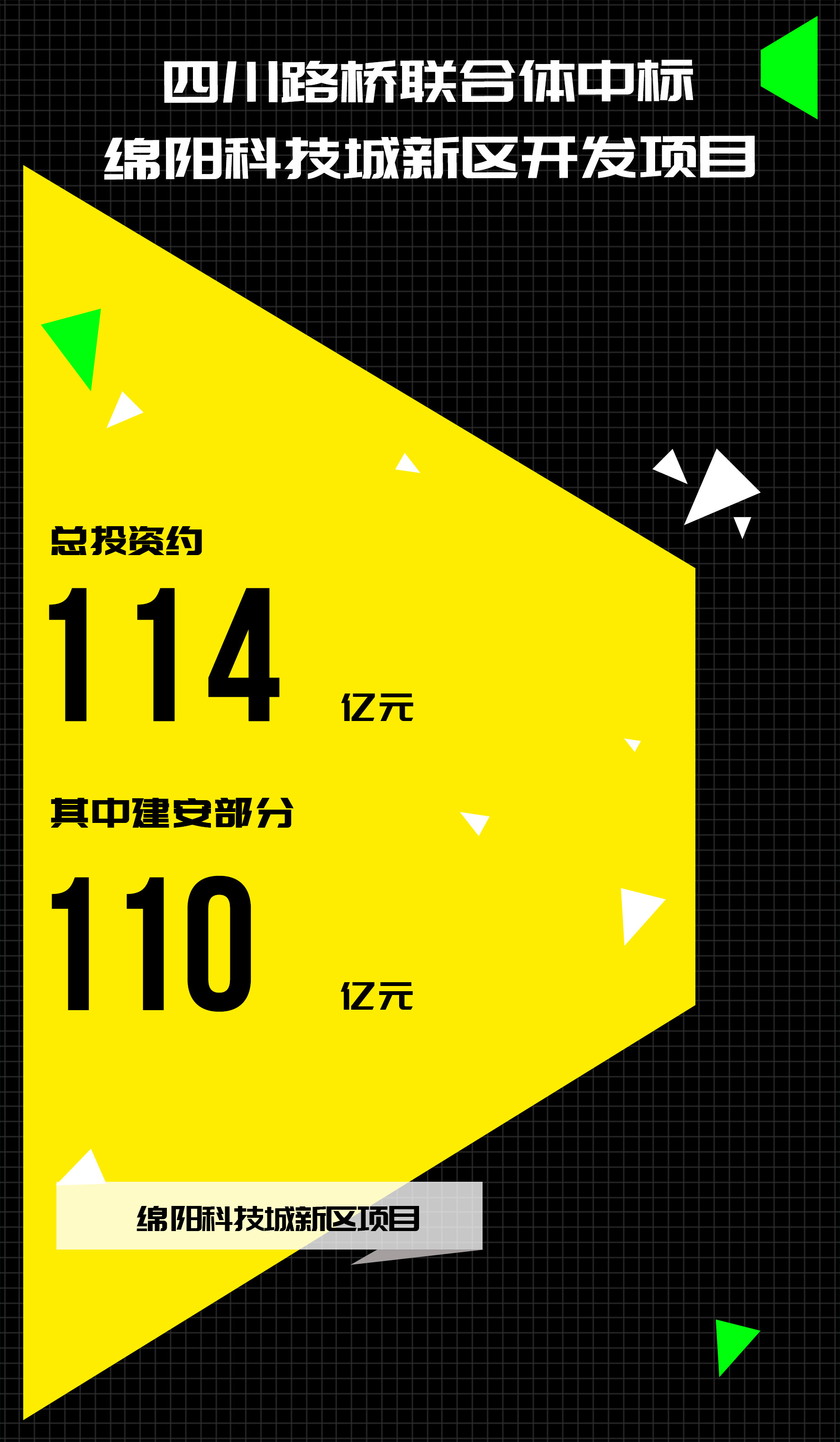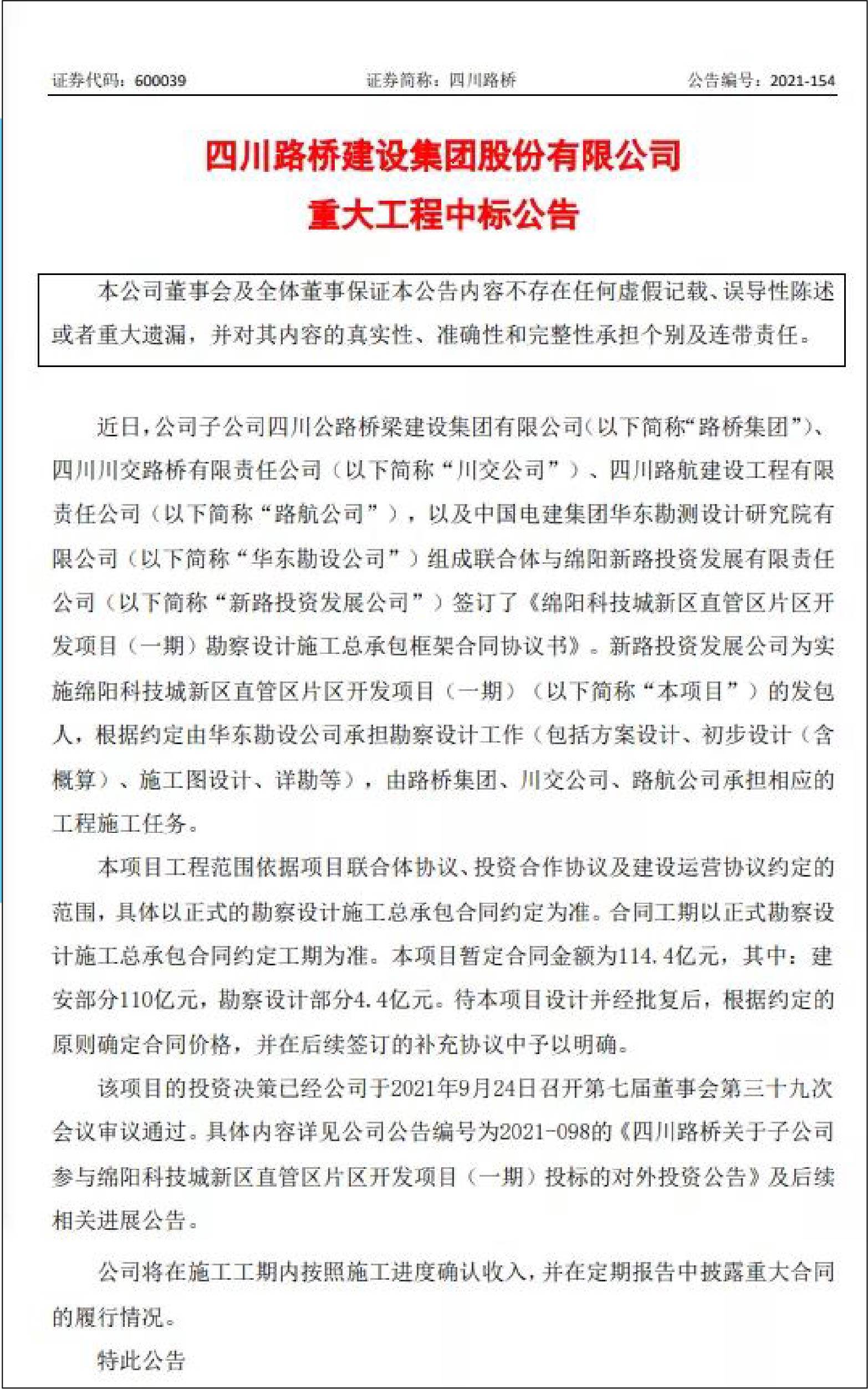 2021年12月24日晚间,四川路桥发布公告显示,近日,四川路桥建设集团股份有限公司子公司四川公路桥梁建设集团有限公司、 四川川交路桥有限责任公司、四川路航建设工程有限责任公司,以及中国电建集团华东勘测设计研究院有限公司组成联合体与绵阳新路投资发展有限责任公司签订了《绵阳科技城新区直管区片区开发项目(一期)勘察设计施工总承包框架合同协议书》。