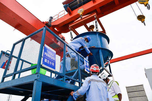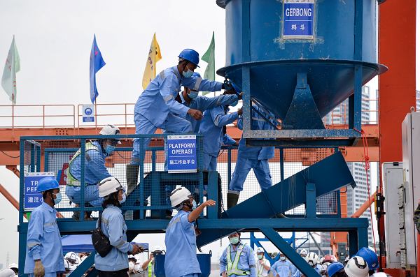 工人在印度尼西亚雅加达至万隆高速铁路CRTSⅢ型无砟轨道板首铺施工现场作业