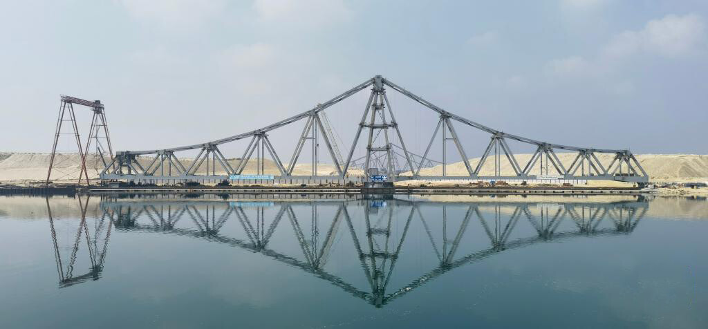在埃及伊斯梅利亚省,由中企承建的苏伊士运河新建法尔达内铁路大桥进行转桥对接测试