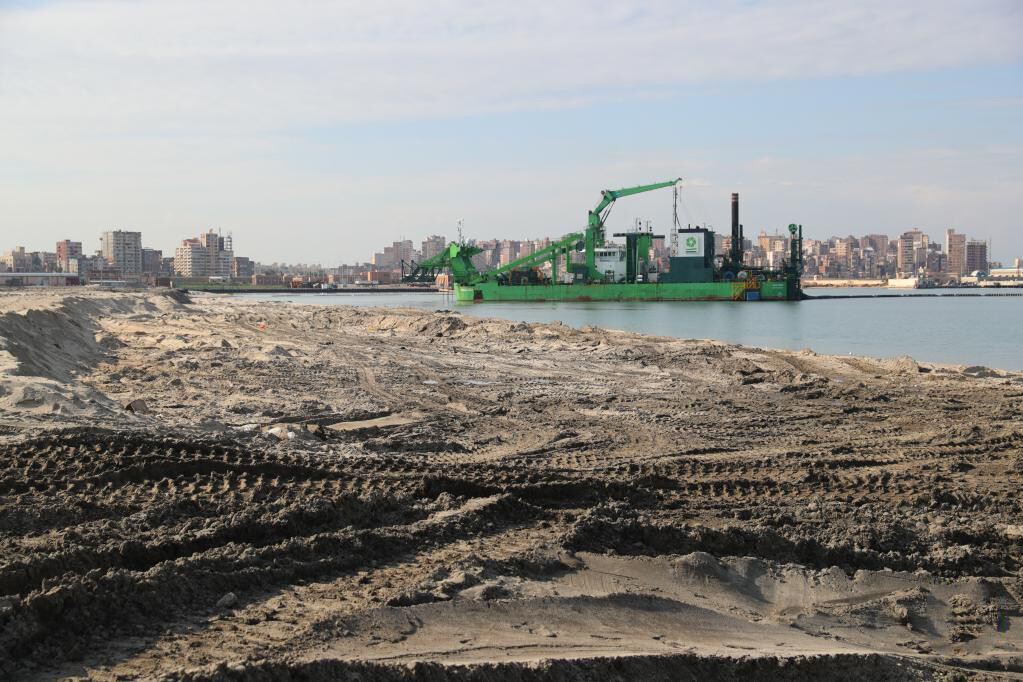 在埃及亚历山大,一艘挖泥船在由中国港湾工程有限责任公司承建的阿布基尔集装箱码头项目建设现场作业