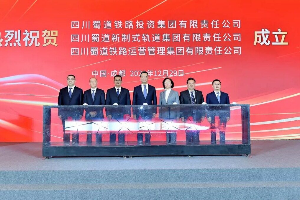 On December 29, 2021, Sichuan Shudao Railway Investment Group Co., Ltd., Sichuan Shudao New Standard Track Group Co., Ltd., and Sichuan Shudao Railway Operation Management Group Co., Ltd. were inaugurated and established in Chengdu. Shudao Group Party Secretary and Chairman Feng Wensheng, Provincial State-owned Assets Supervision and Administration Commission Party Committee Member and Deputy Director You Daili, China Railway Chengdu Bureau Group Corporation Deputy General Manager Wang Song, Provincial Development and Reform Commission second-level inspector Du Yi, Provincial Transportation Department second-level Inspector Dan Lun, Deputy Secretary and District Mayor Jing Bo of Wuhou District Committee of Chengdu, and Zhang Sheng, Member of the Party Committee and Vice Chairman of Shudao Group, jointly unveiled the plaque. You Daili, Wang Song, Du Yi, Danlun, Jing Bo, and Tang Yong, deputy secretary, vice chairman and general manager of the Shudao Group Party Committee delivered speeches respectively. Yang Rugang, deputy general manager of Shudao Group presided over.