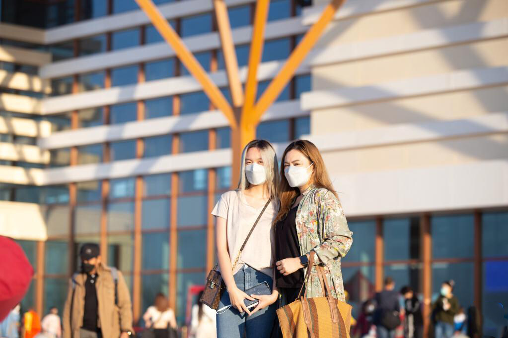2021年12月12日,旅客在中老铁路万象站广场拍照