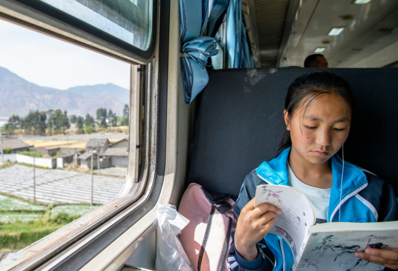 2021年4月15日,一名喜德县瓦尔学校的学生乘坐5634次列车回家