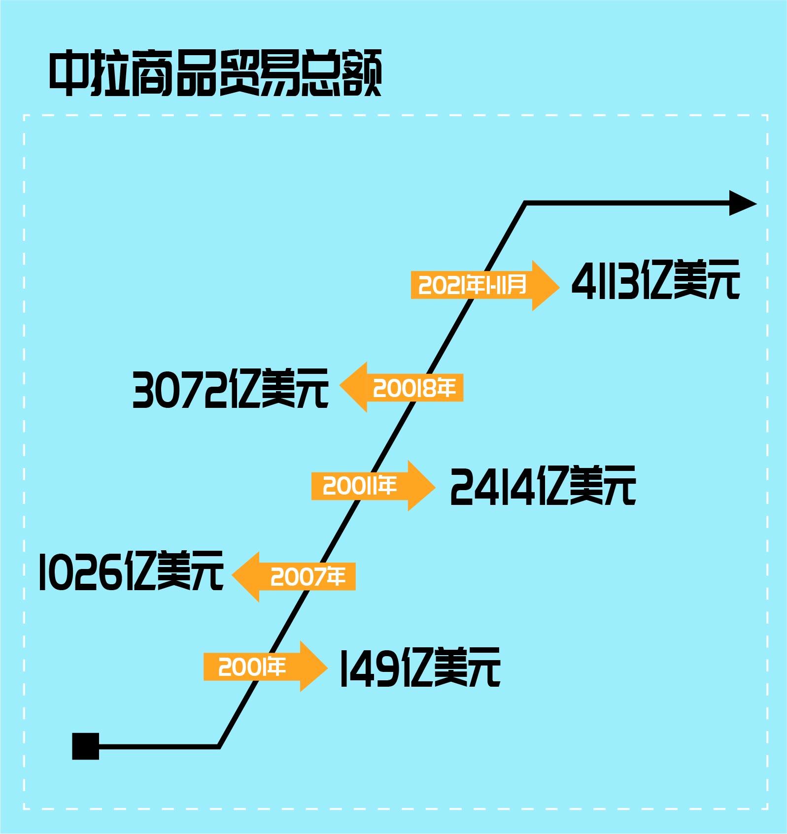 自2001年中国加入世界贸易组织以来,中国与拉美的商品贸易总额连续跨越了1000亿美元、2000亿美元、3000亿美元和4000亿美元4个台阶。2001年中拉商品贸易总额约为149亿美元,2007年达到1026亿美元,2011年达到2414亿美元,2018年达到3072亿美元,2021年1-11月达到4113亿美元。