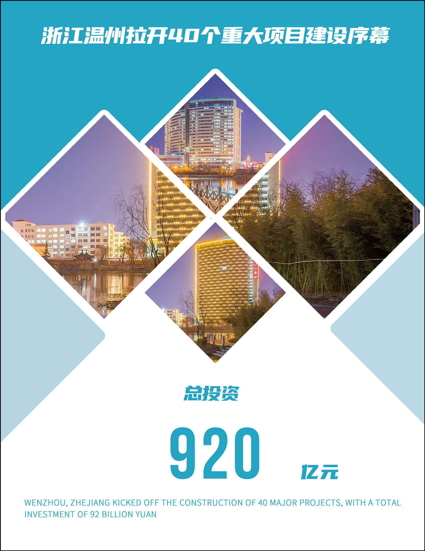 2022年1月5日,浙江省举行扩大有效投资重大项目集中开工活动,其中温州共组织40个项目参加,总投资920亿元,年度计划投资110亿元,项目数量和总投资额均居浙江省第二。