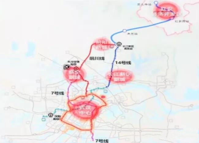 武汉红安市域(郊)铁路工程初步规划与武汉轨道交通7号线、14号线和前川线衔接,连接天河空港枢纽、汉阳高铁站两大综合交通枢纽,串联红安经济开发区与前川新城、武汉长江新区副城及临空副城,全长约70公里。