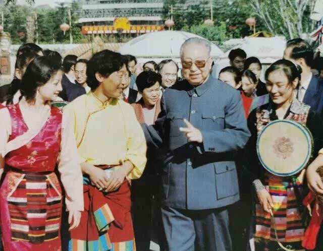华国锋在参观深圳锦绣中华时,与在这里工作的少数民族工作人亲切交谈